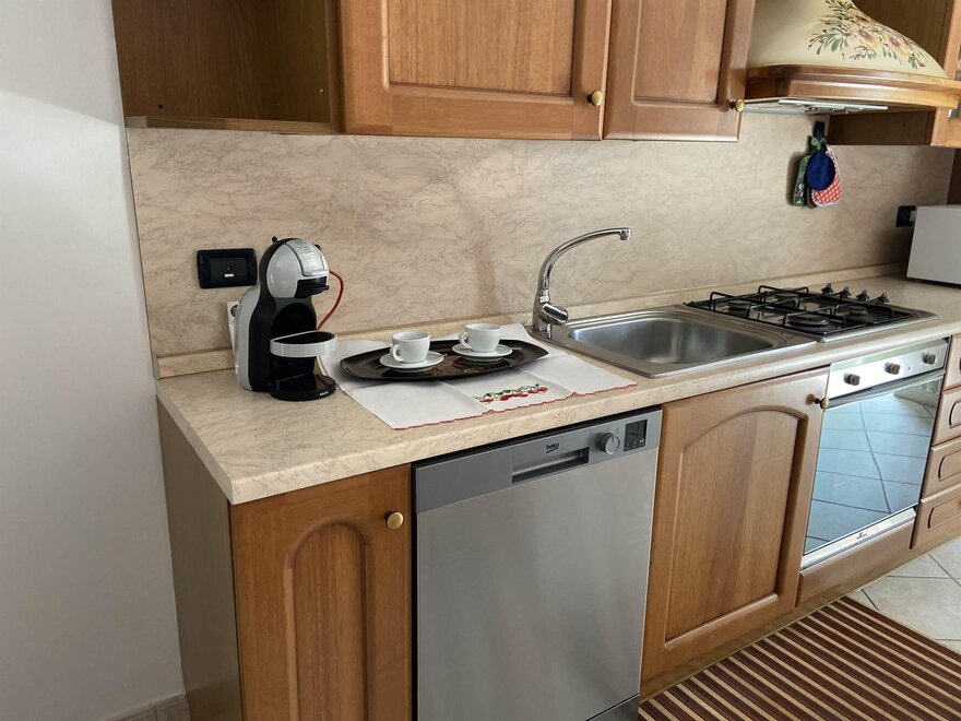 Im Wohnbereich befindet sich auch eine Küche mit Elektrogeräten wie Spülmaschine, Kühlschrank mit Gefrierfach, Kaffeemaschine, Mikrowelle, die mit Geschirr und allem Nötigen für Ihren Aufenthalt ausgestattet ist.