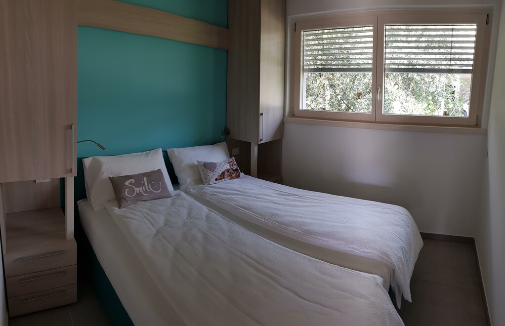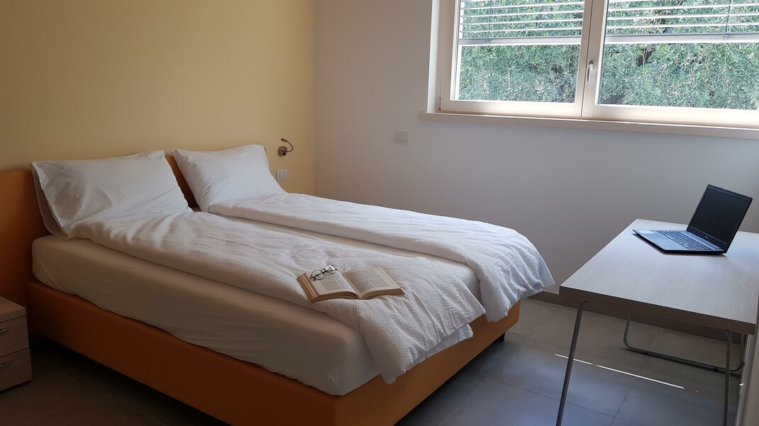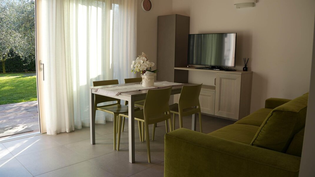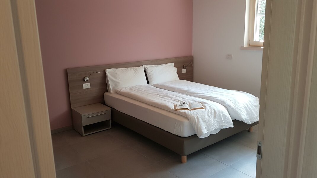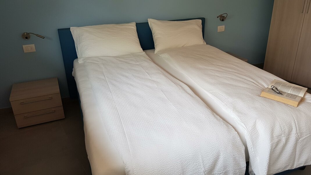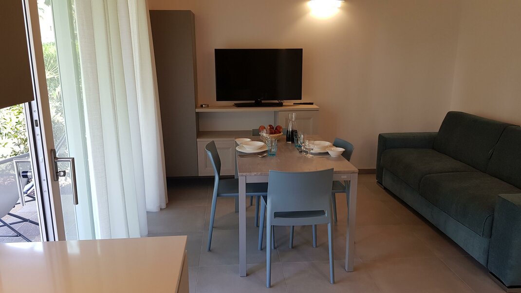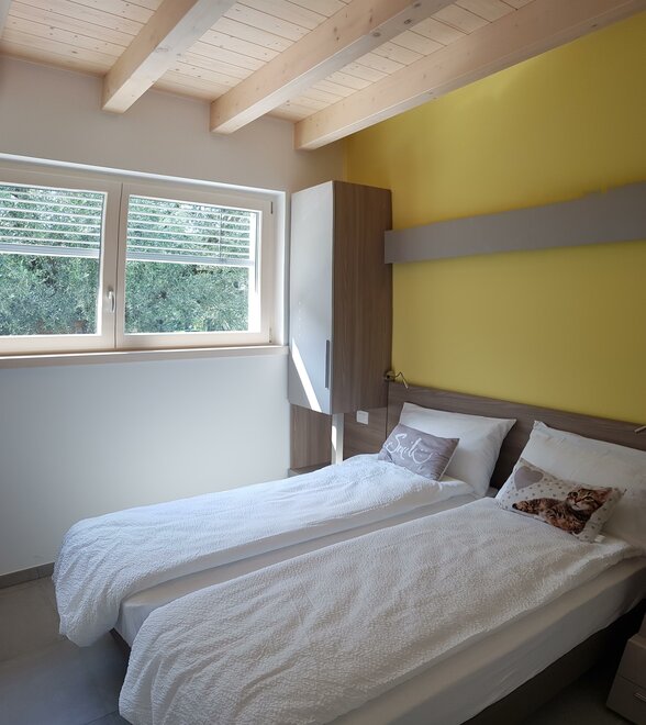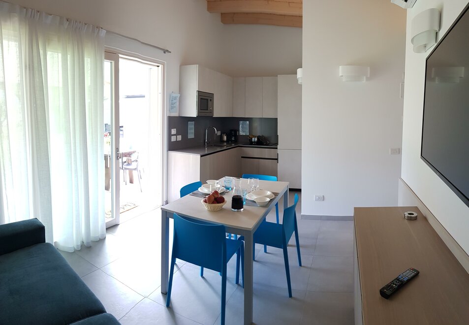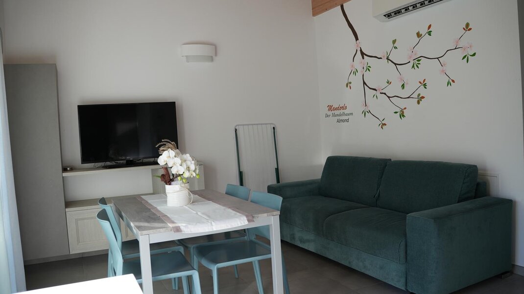 Die Ferienwohnung „Il Mandorlo“ liegt im Erdgeschoss und zeichnet sich durch eine hohe Decke mit Holzbalken aus. Die gepflegte Einrichtung ist modern gehalten und besteht aus einer gut ausgestatteten Kochnische, einem großen, hellen Wohnzimmer mit Schlafcouch für 1 oder 2 Personen, Satellitenfernsehen, einem komfortablen Doppelzimmer für 2 Personen mit viel Platz bietendem Kleiderschrank, Sicher, Schreibtisc; einem Schlafzimmer mit 2 Einzelbetten für 1 oder 2 Personen; sowie aus einem großen Bad mit breiter Dusche und Fön. Die Wohnung verfügt über einen Außenbereich mit eigener, überdachter Veranda, Tisch und Stühlen, Liegestuhl und Sonnenliege. Jede Wohnung verfügt darüber hinaus über einen kostenlosen Parkplatz im Freien.