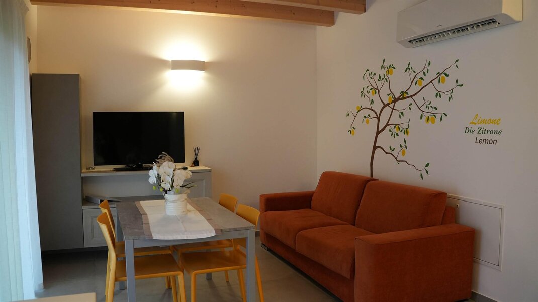 Die Ferienwohnung „Il Limone“ liegt im Erdgeschoss und zeichnet sich durch eine hohe Decke mit Holzbalken aus. Die gepflegte Einrichtung ist modern gehalten und besteht aus einer gut ausgestatteten Kochnische, einem großen, hellen Wohnzimmer mit Schlafcouch für 1 oder 2 Personen, Satellitenfernsehen, einem komfortablen Doppelzimmer für 2 Personen mit viel Platz bietendem Kleiderschrank, Sicher, Schreibtisc; einem Schlafzimmer mit 2 Einzelbetten für 1 oder 2 Personen; sowie aus einem großen Bad mit breiter Dusche und Fön. Die Wohnung verfügt über einen Außenbereich mit eigener, überdachter Veranda, Tisch und Stühlen, Liegestuhl und Sonnenliege. Jede Wohnung verfügt darüber hinaus über einen kostenlosen Parkplatz im Freien.