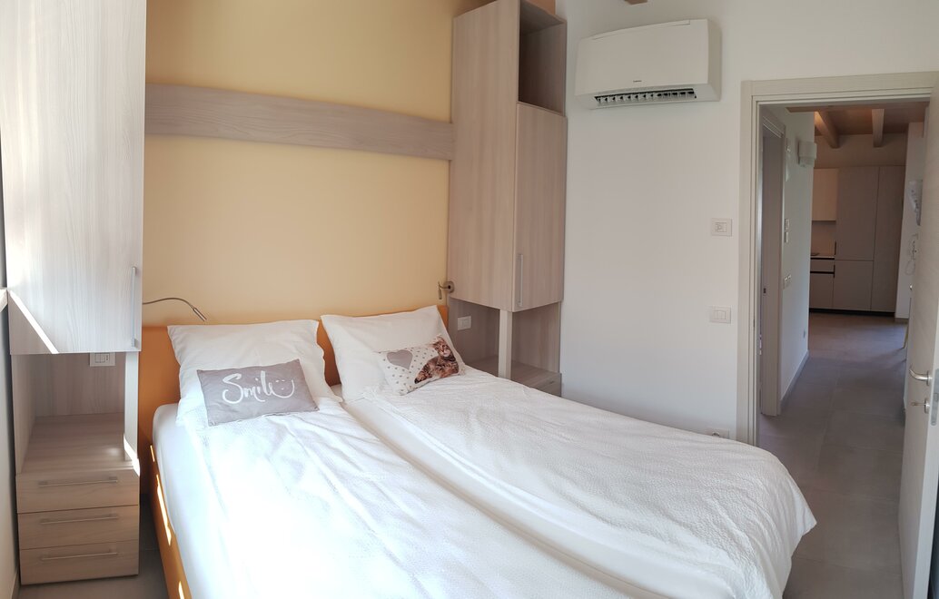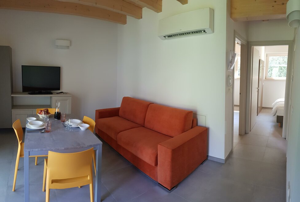 Die Ferienwohnung „L' Arancio“ liegt im Erdgeschoss und zeichnet sich durch eine hohe Decke mit Holzbalken aus. Die gepflegte Einrichtung ist modern gehalten und besteht aus einer gut ausgestatteten Kochnische, einem großen, hellen Wohnzimmer mit Schlafcouch für 1 oder 2 Personen, Satellitenfernsehen, einem komfortablen Doppelzimmer für 2 Personen mit viel Platz bietendem Kleiderschrank, Sicher, Schreibtisc; einem Schlafzimmer mit 2 Einzelbetten für 1 oder 2 Personen; sowie aus einem großen Bad mit breiter Dusche und Fön. Die Wohnung verfügt über einen Außenbereich mit eigener, überdachter Veranda, Tisch und Stühlen, Liegestuhl und Sonnenliege. Jede Wohnung verfügt darüber hinaus über einen kostenlosen Parkplatz im Freien.