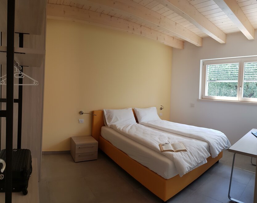 Die Ferienwohnung „Il Pesco“ liegt im Erdgeschoss und zeichnet sich durch eine hohe Decke mit Holzbalken aus. Die gepflegte Einrichtung ist modern gehalten und besteht aus einer gut ausgestatteten Kochnische, einem großen, hellen Wohnzimmer mit Schlafcouch für 1 oder 2 Personen, Satellitenfernsehen, einem komfortablen Doppelzimmer für 2 Personen mit viel Platz bietendem Kleiderschrank, Sicher, Schreibtisc; einem Schlafzimmer mit 2 Einzelbetten für 1 oder 2 Personen; sowie aus einem großen Bad mit breiter Dusche und Fön. Die Wohnung verfügt über einen Außenbereich mit eigener, überdachter Veranda, Tisch und Stühlen, Liegestuhl und Sonnenliege. Jede Wohnung verfügt darüber hinaus über einen kostenlosen Parkplatz im Freien.