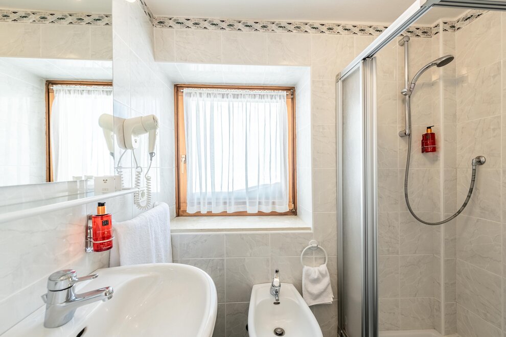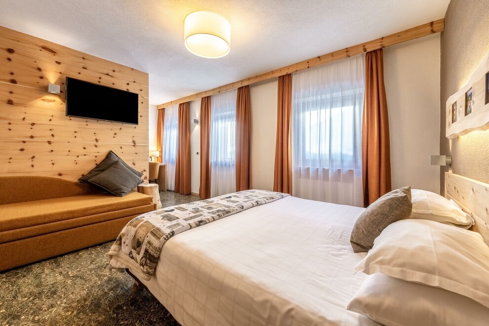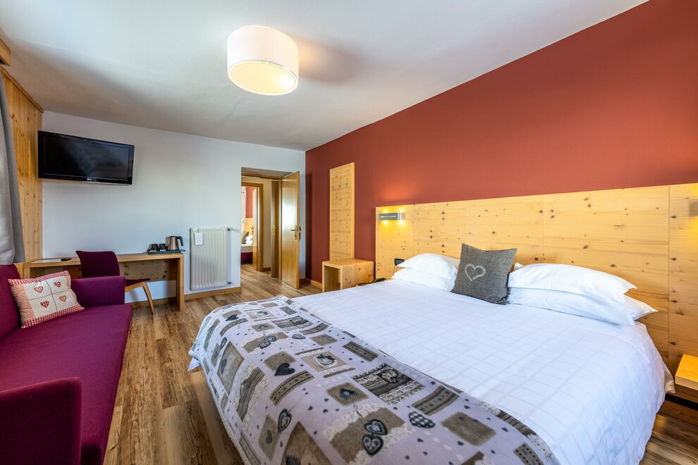 Zimmer mit Blick auf die Berge, bestehend aus einem zentralen Eingang und zwei separaten Zimmern mit Schreibtisch, Safe und Flachbild-Sat-TV. Diese Lösung ist für eine Familie oder eine Gruppe von Freunden geeignet und verfügt über ein eigenes internes Badezimmer zwischen den beiden Zimmern mit Bidet, Dusche, Haartrockner und Pflegeprodukten sowie eine Tee- / Kaffeestation und kostenloses WLAN. Bitte geben Sie bei der Buchung Ihre gewünschte Bettenart an.