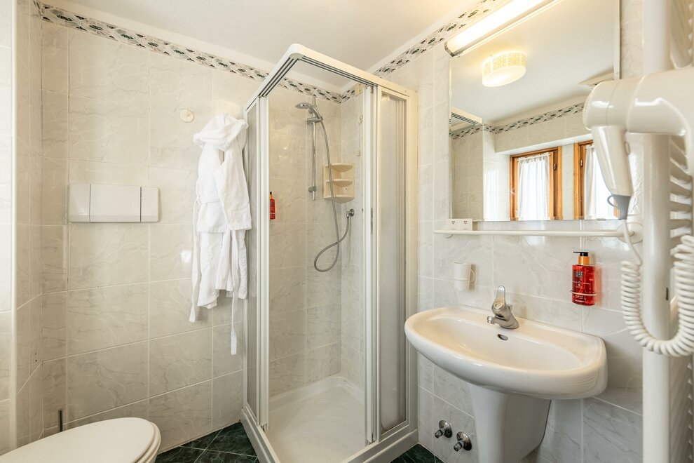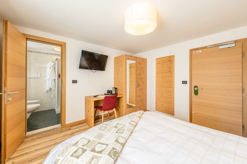 Das Zimmer ist aus duftendem Zirbenholz mit Blick auf die Sellagruppe/Sass Pordoi eingerichtet und verfügt über ein eigenes Bad mit Bidet, Dusche und Pflegeprodukten, Tee- und Kaffeestation, einen Schreibtisch, einen Safe, kostenfreies WLAN und einen Flachbild-Sat-TV. Bitte geben Sie bei der Buchung Ihre gewünschte Bettenart an.