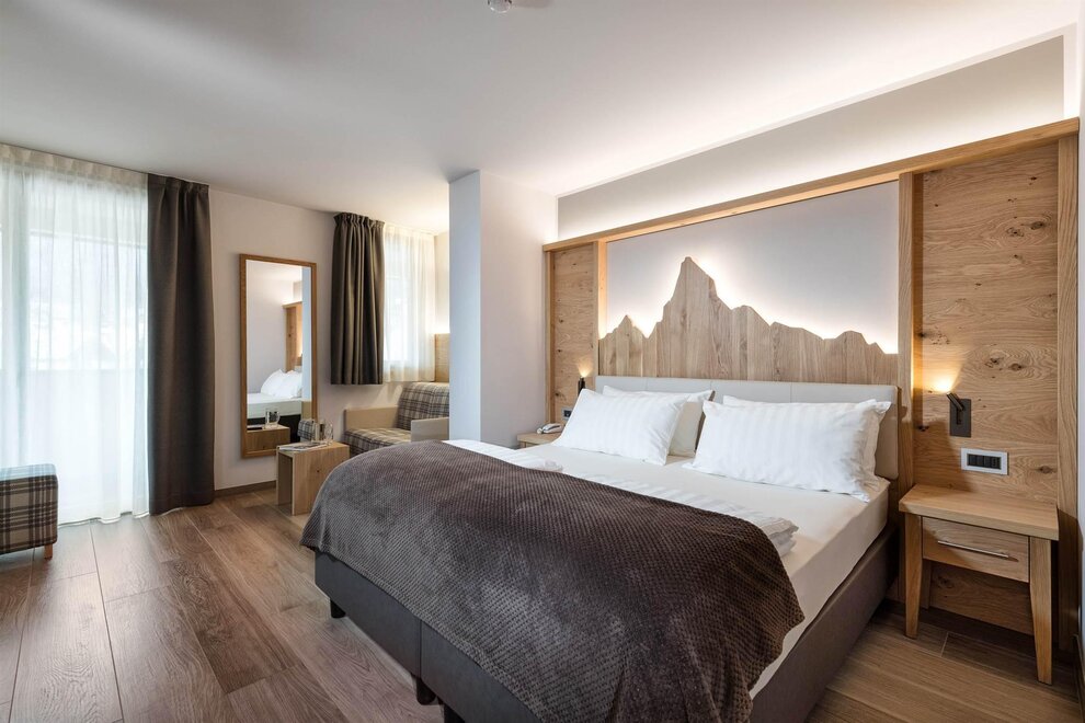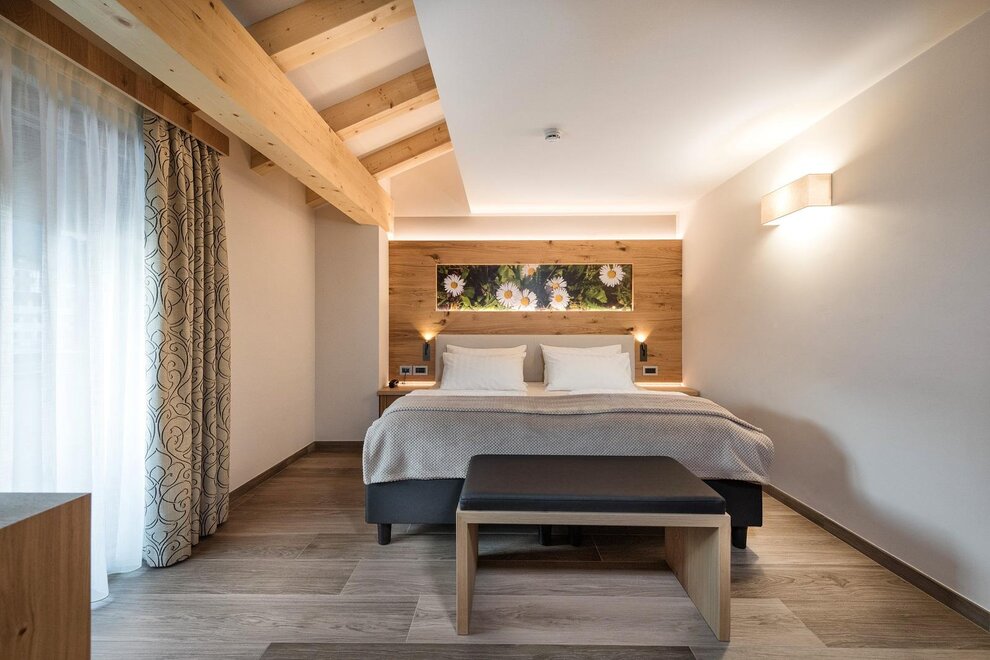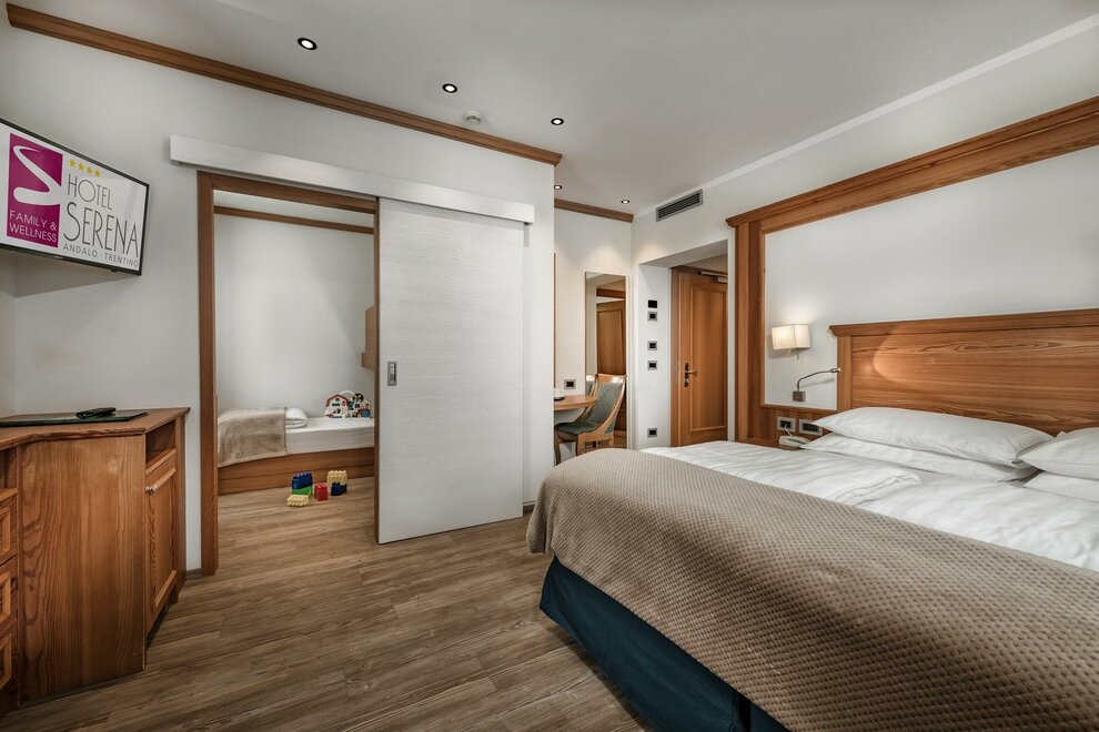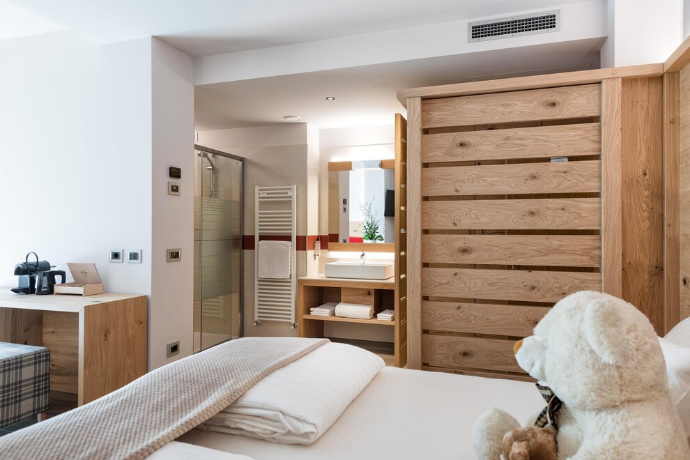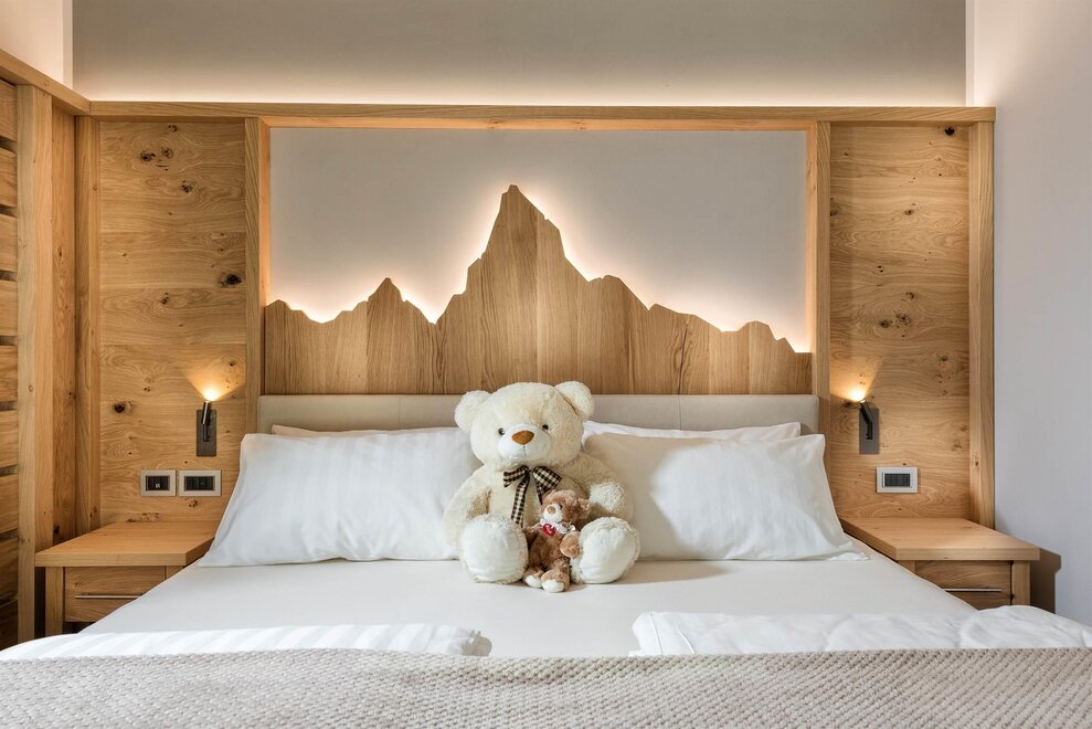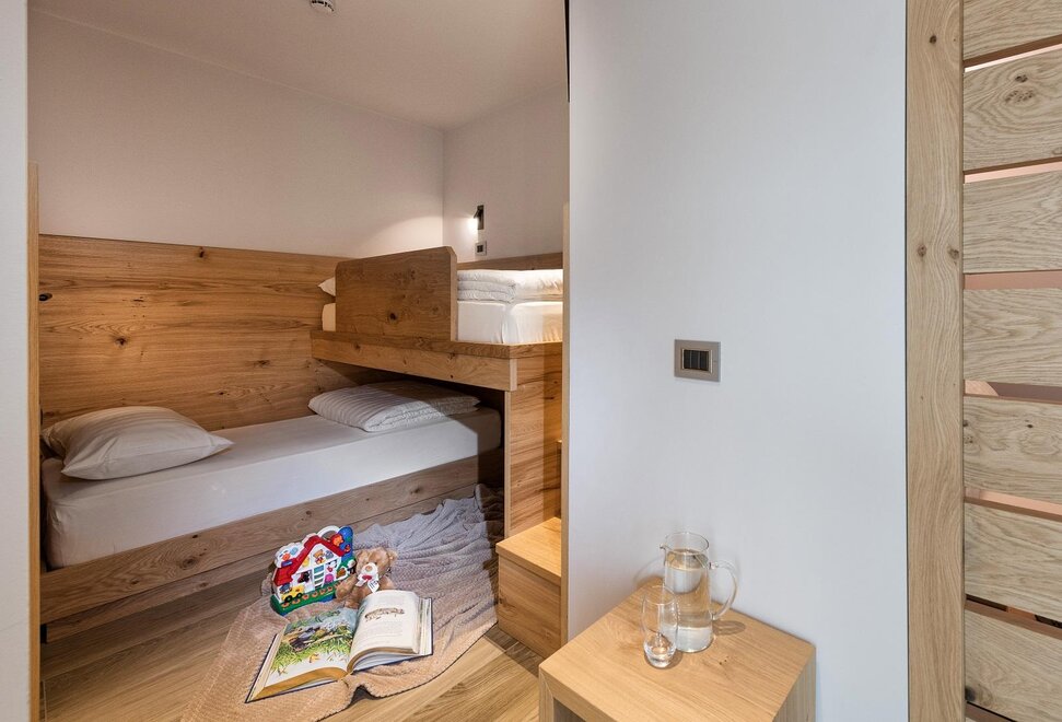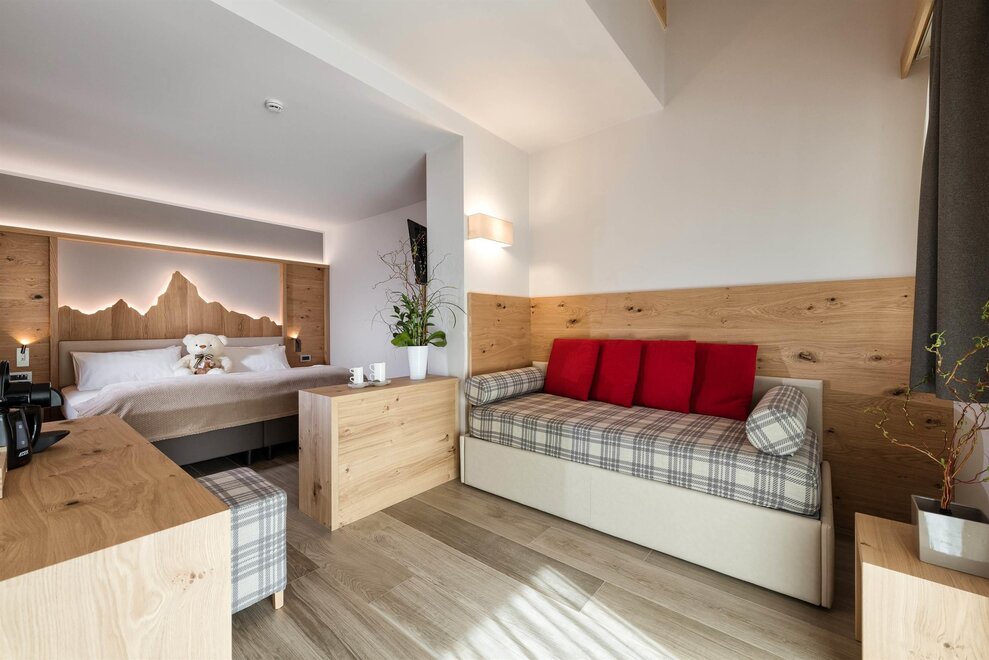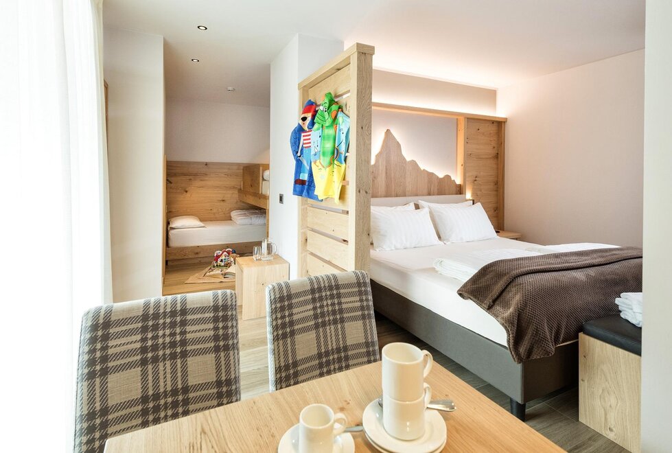 Dieses Zimmer im traditionellen alpinen Stil eignet sich hervorragend für Familien mit einem Kind. Das hochwertige Interieur aus Holz und die klassischen Farbakzente vermitteln Gemütlichkeit und Wohnkomfort. Auf Wunsch stellen wir Ihnen zusätzlich ein Kinderbett oder eine Wiege zur Verfügung.