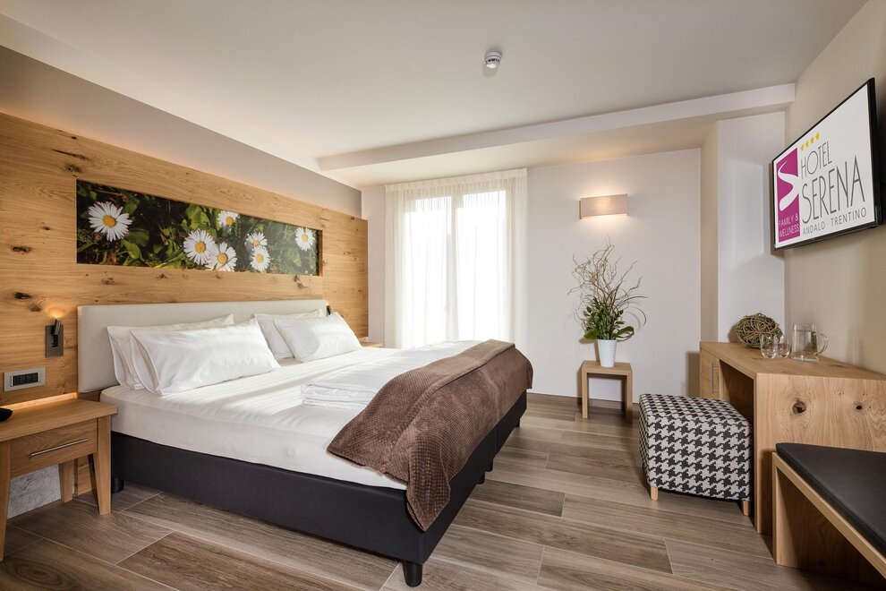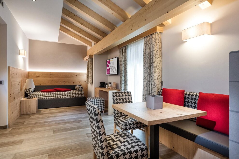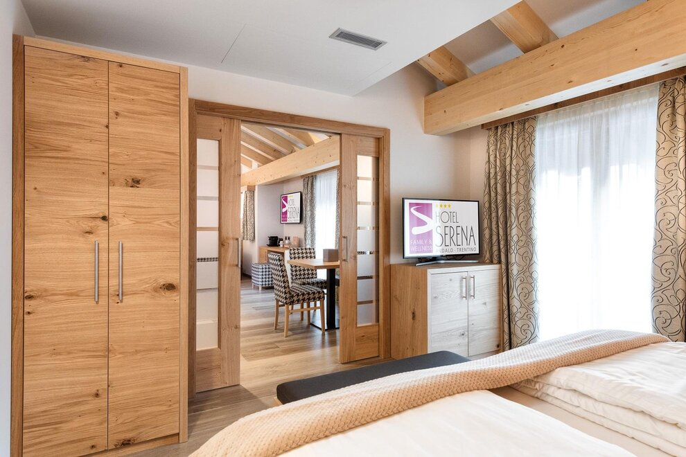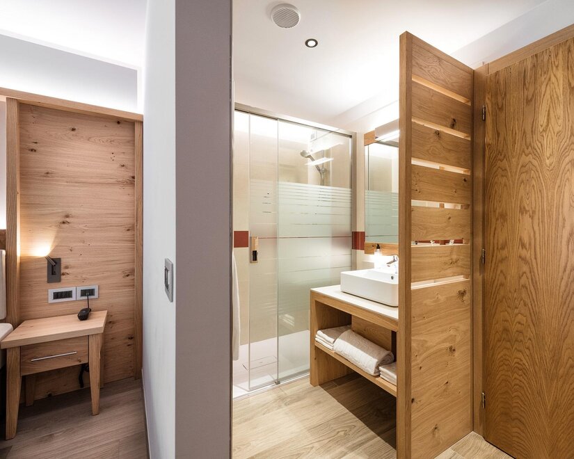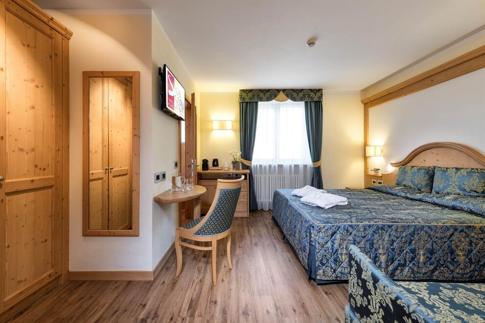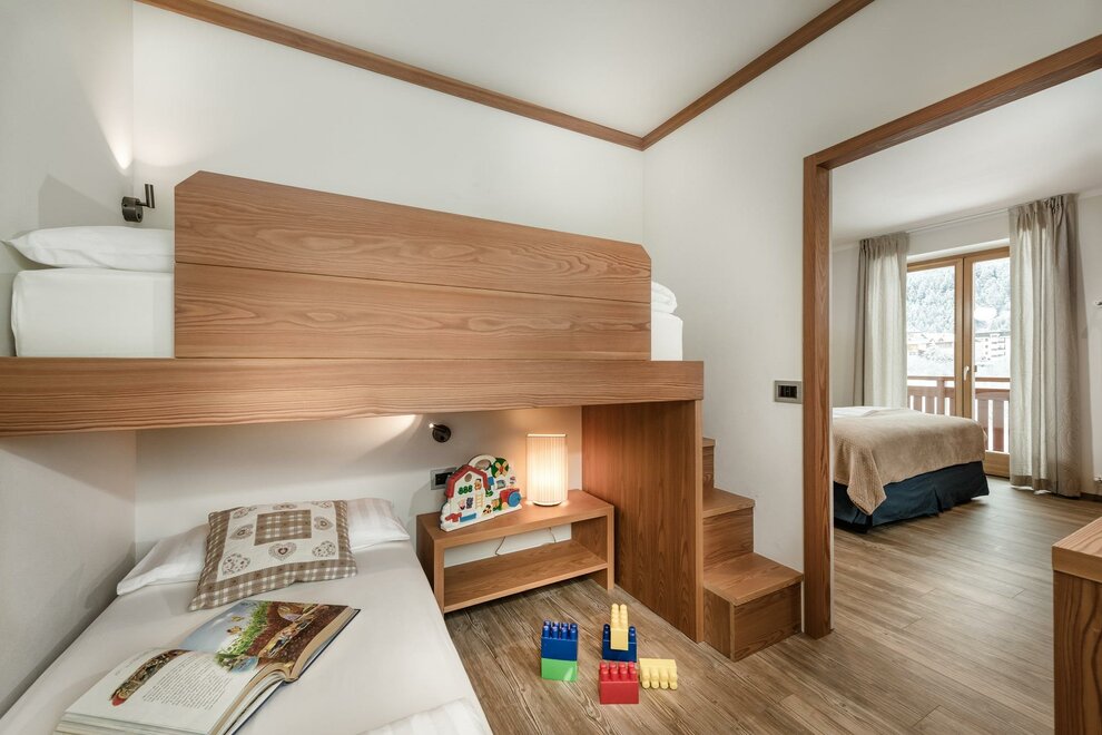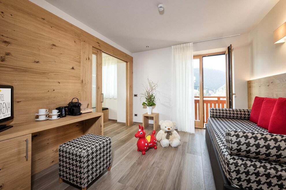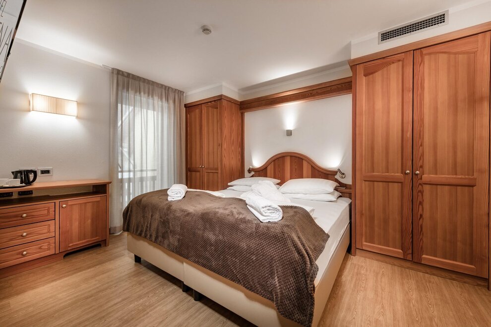 Dieses Zimmer im traditionellen alpinen Stil eignet sich hervorragend für Familien mit einem Kind. Das hochwertige Interieur aus Holz und die klassischen Farbakzente vermitteln Gemütlichkeit und Wohnkomfort. Auf Wunsch stellen wir Ihnen zusätzlich ein Kinderbett oder eine Wiege zur Verfügung.