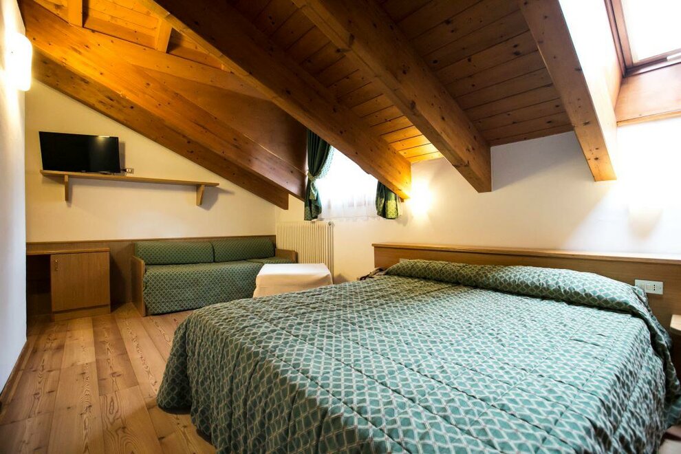 Zimmer Familien: Ein Doppelbett, einem dritten und bei Bedarf auch einem vierten Bett, kleiner Balkon oder typischer Dachbodenausbau aus Holz, Holzfußböden aus italienischer Lärche, Flachbild-Fernseher, Safe, Telefon, Bad mit Dusche und Haartrockner, Duschset (Shampoo, Seife, Duschhaube); Unsere Zimmer sind alle mit Wasserspar-Techniken ausgestattet, denn wir wollen kein Wasser verschwenden, um diese Ressource für alle Lebewesen zu erhalten. Für die tägliche Reinigung der Räumlichkeiten verwenden unsere Mitarbeiter nur umweltverträgliche Produkte. Die Bettwäsche wird auf Wunsch unserer Gäste jederzeit gewechselt.