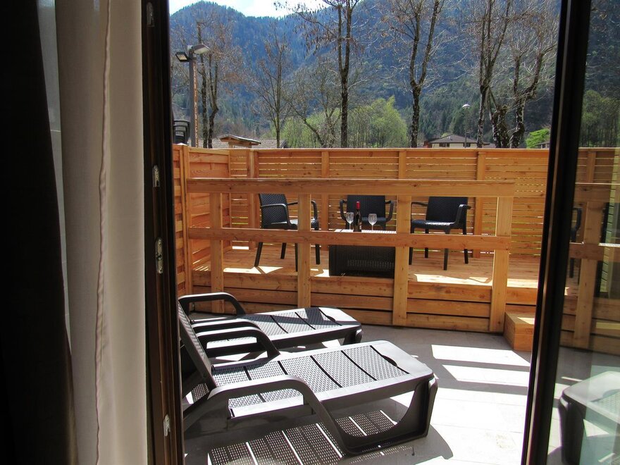 Neue Zimmer im Erdgeschoss mit großer Terrasse, ausgestattet mit Tisch, Stühlen und Sonnenliegen aus natürlichem Zirbenholz, geeignet für Familien bis zu 4 Personen.