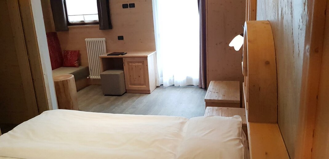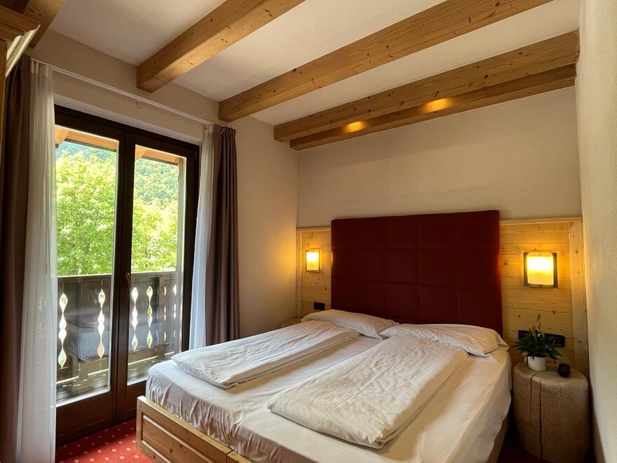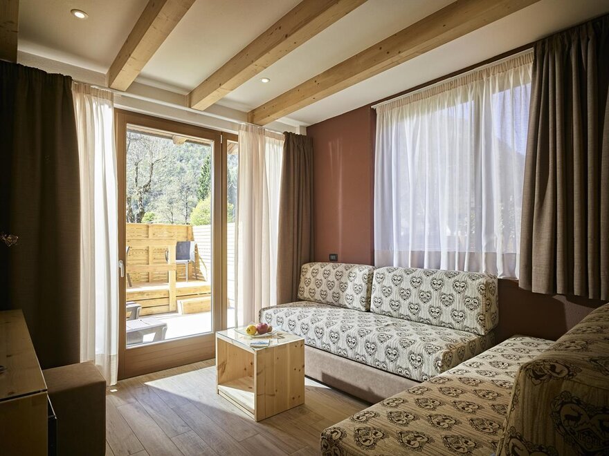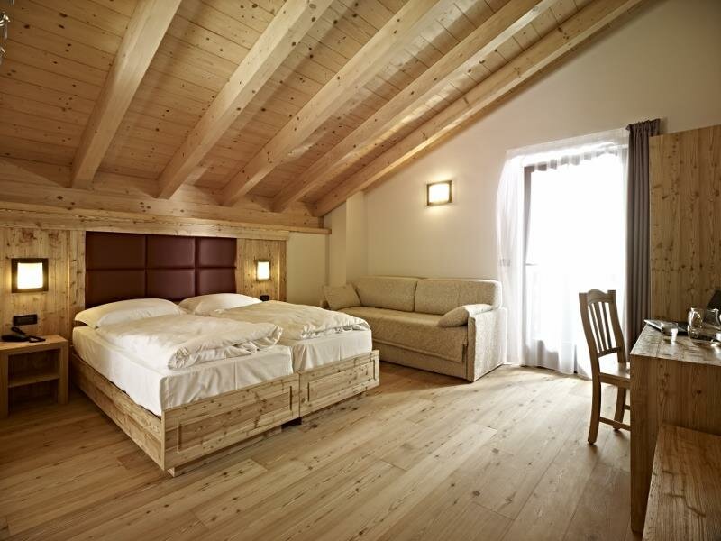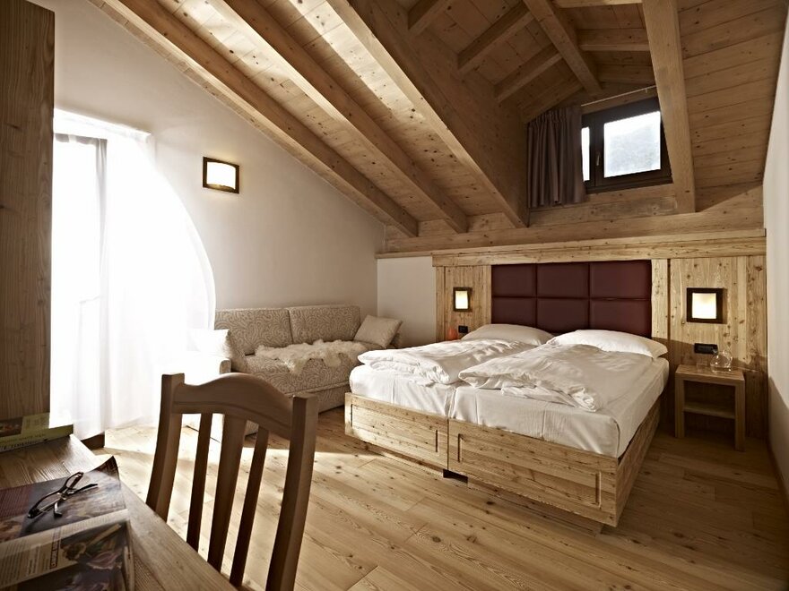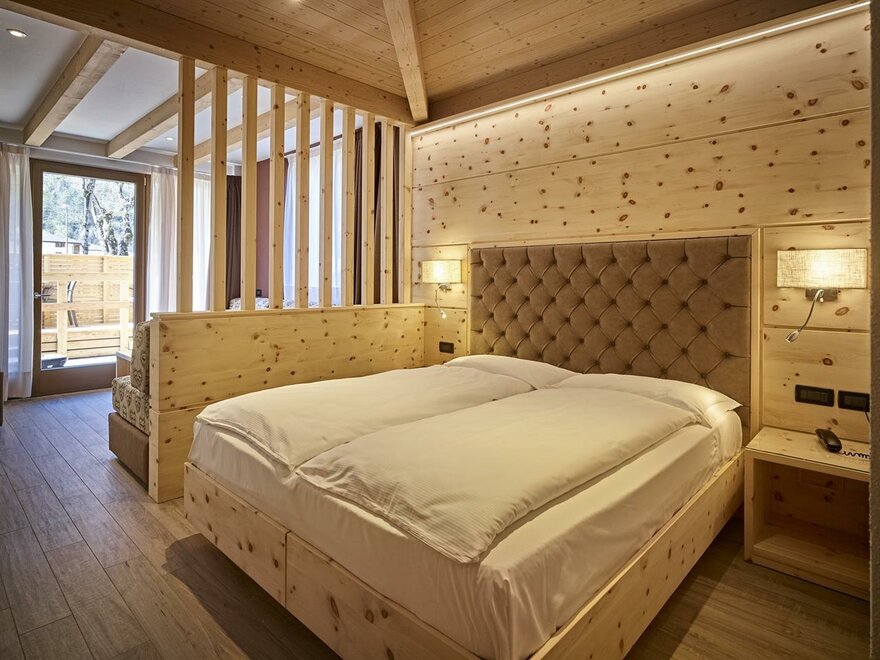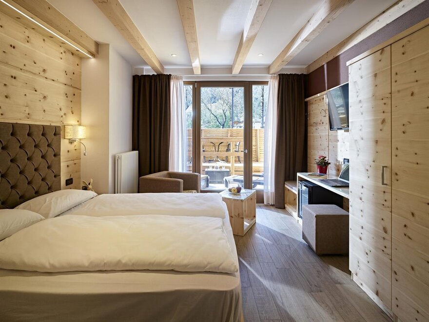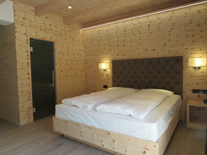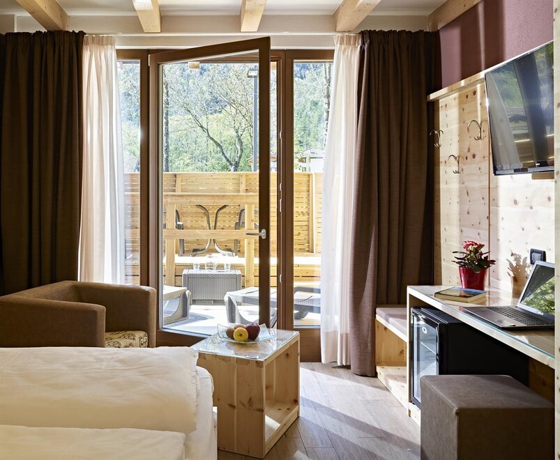 Eine warme Umarmung mit der Natur, ein erholsamer Platz, ideal um sich einmal von allen und allem zu erholen. Die neuen Zimmer im Erdgeschoss, im modernen alpinen Stil, sind eingerichtet in wohlriechender Zirbel-Kiefer, eine Duft-Essenz, die seit eher als natürlich beruhigend gilt, der Gesundheit und dem Schlaf der Menschen gut tut. Die Bio Deluxe Zimmer sind sehr geräumig und für Familien gedacht. Sie überraschen mit verschiedenen Einzigartigkeiten in jedem Zimmer und sie erweitern sich alle um eine gemütliche angrenzende Terrasse, nach Süden ausgerichtet, bereichert durch Relax Liegen.