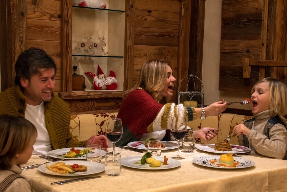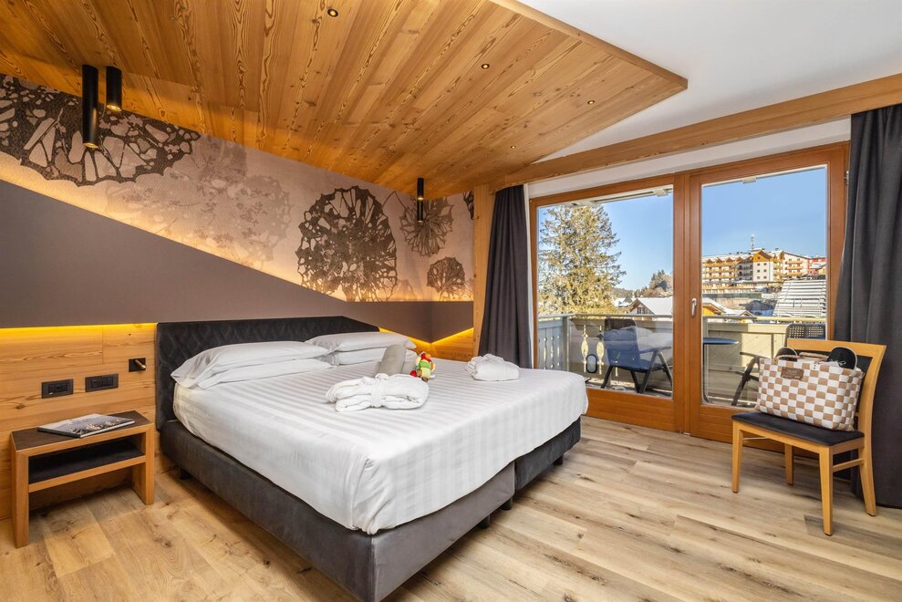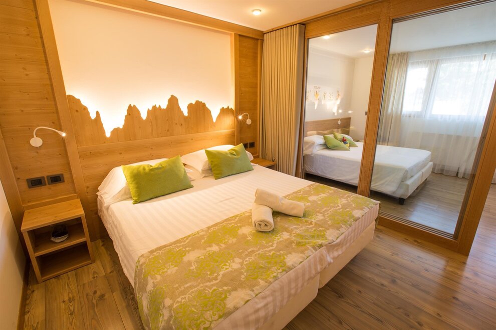 Komfortabler Family Room, Einrichtung aus Tannenholz und Stein, Kinderzimmer vollständig getrennt vom Ehebettzimmer, Dusche, doppelter Balkon, doppelter Fernseher und Parkettboden, Led-Fernseher 42", DVD-Lesegerät, Haartrockner, Safe, Minibar, Sommier Betten King Size, WiFi kostenlos, Bademäntel für Erwachsene und Kinder. Es werden mindestens 3 Quoten berechnet.