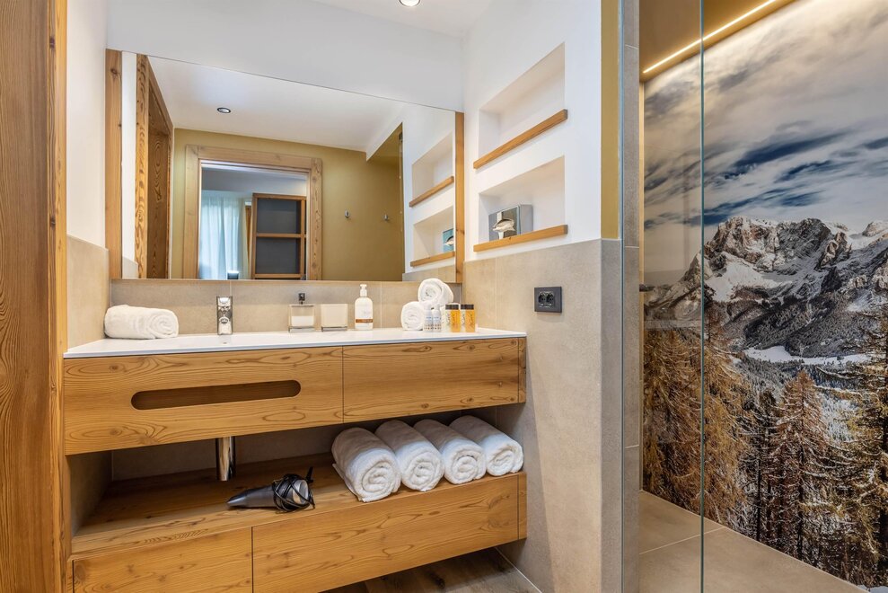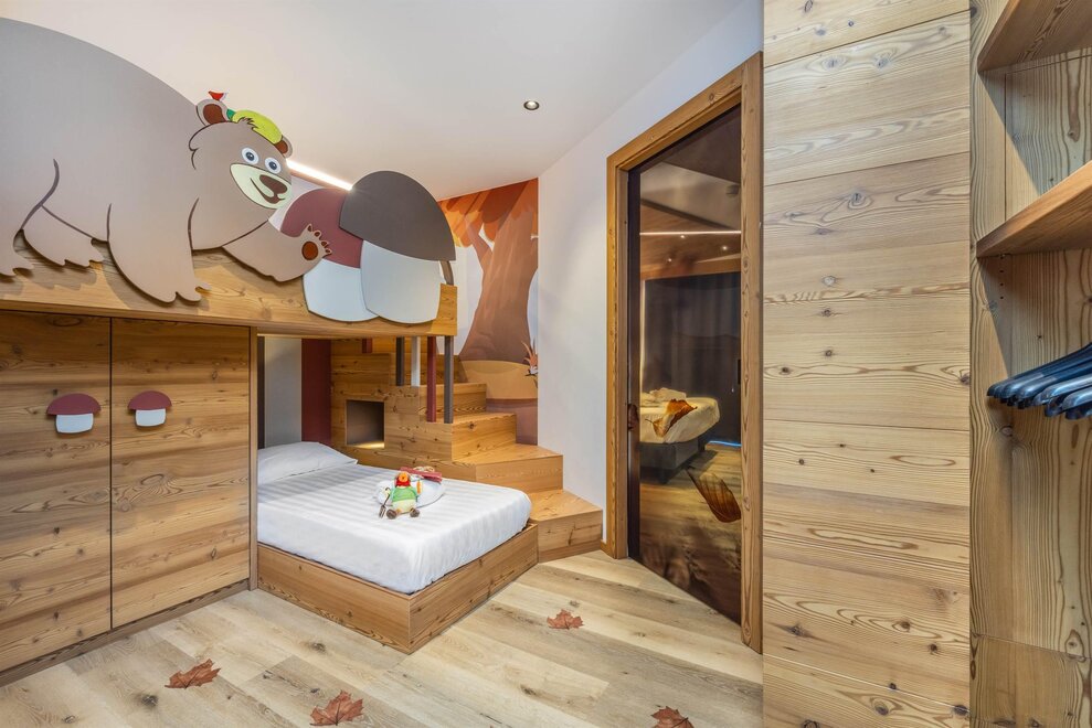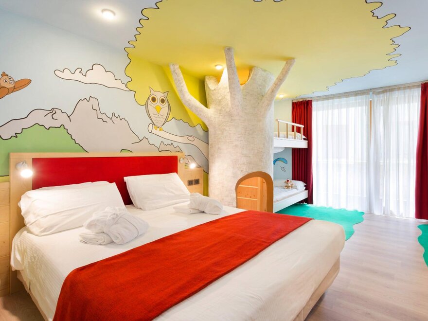 Vollständig renoviertes Familienzimmer in naturbelassener Lärche, Balkon, Parkettboden, thematische Kinderzone mit dem "Bärenhöhle Bruno" und kleiner gemütlicher Ecke, Kinderzimmer mit Einzelbetten getrennt vom Schlafzimmer mit Kingsize-Bett, großes Badezimmer mit Dusche, zwei LCD-Fernseher (50" und 39"), Erwachsenen- und Kinderbademäntel sowie Wasserkocher mit einer Auswahl an Teesorten stehen zur Verfügung.