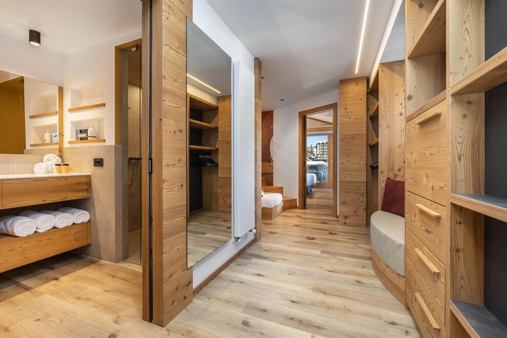 Eine entspannende Junior Suite mit moderner Einrichtung aus gebleichtem Eichenholz, vollständig renoviert, Wohnecke, Parkettboden, begehbarer Kleiderschrank, Wohnraum und Ehebettzimmer in Open Space, im letzten Stock mit Doppelbalkon, doppeltes Bad, Led-Fernseher 42", DVD-Lesegerät, Haartrockner, Safe, Minibar, Sommier Betten King Size, WiFi kostenlos, Bademäntel für Erwachsene und Kinder.