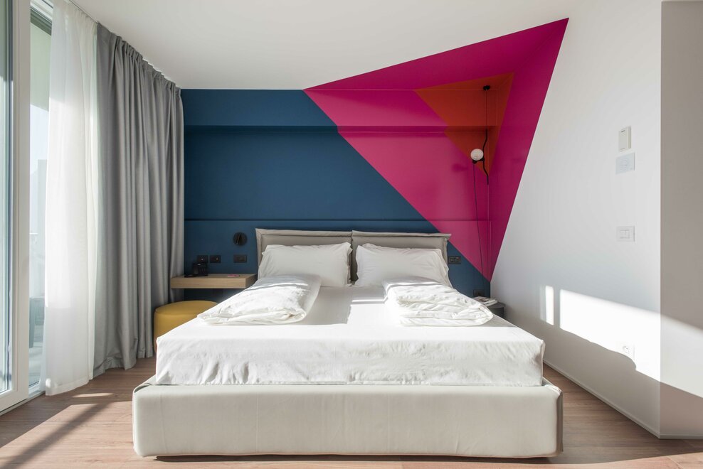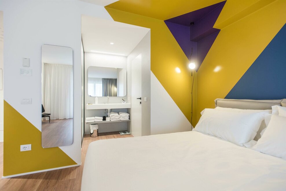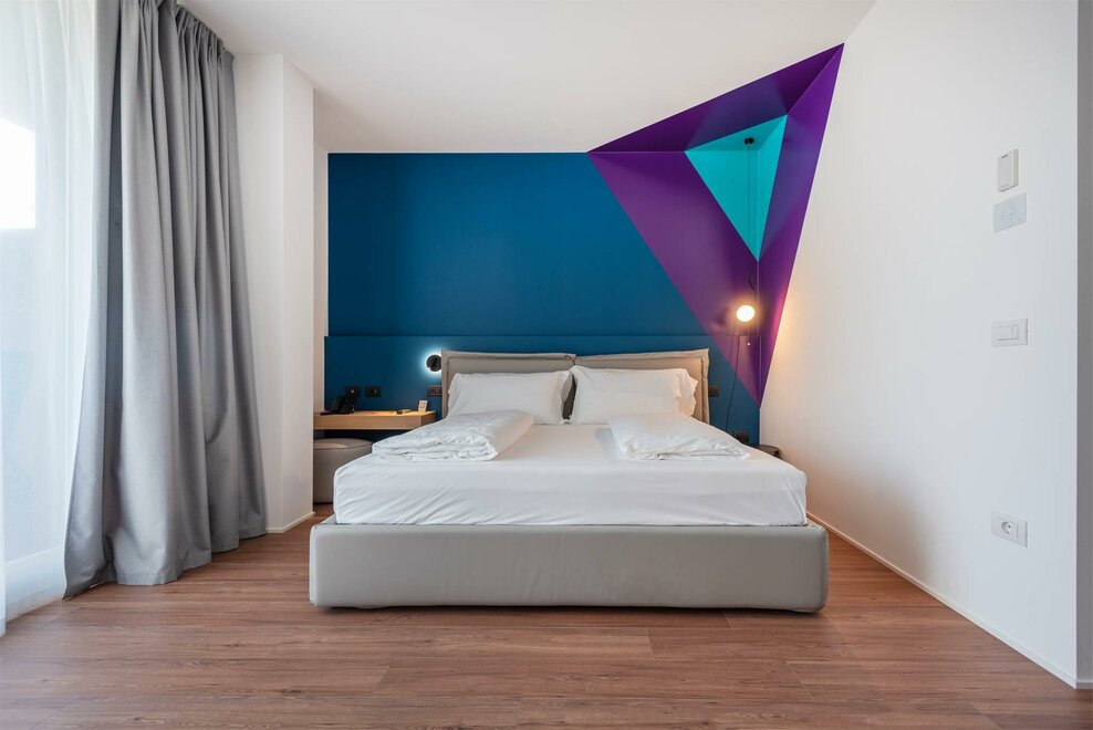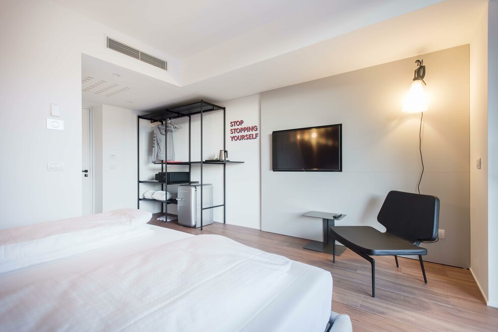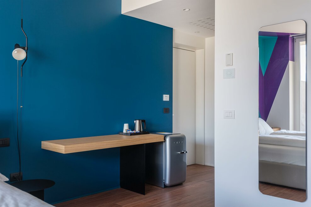 Happy Room ist die Lösung für diejenigen, die Einfachheit, Komfort und Stil suchen. Hier finden Sie alles, was Sie für Ihre Erholung brauchen: ein großes Doppelbett mit Dorelan ReActive® Matratze, Flachbildfernseher, SMEG-Sportbar und Badezimmer mit Dusche.