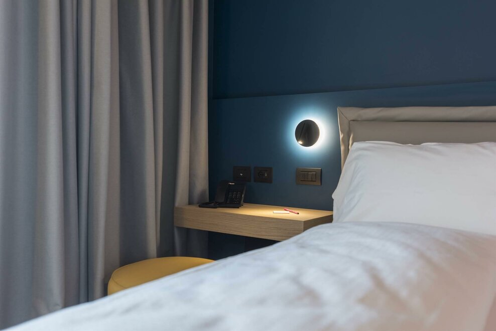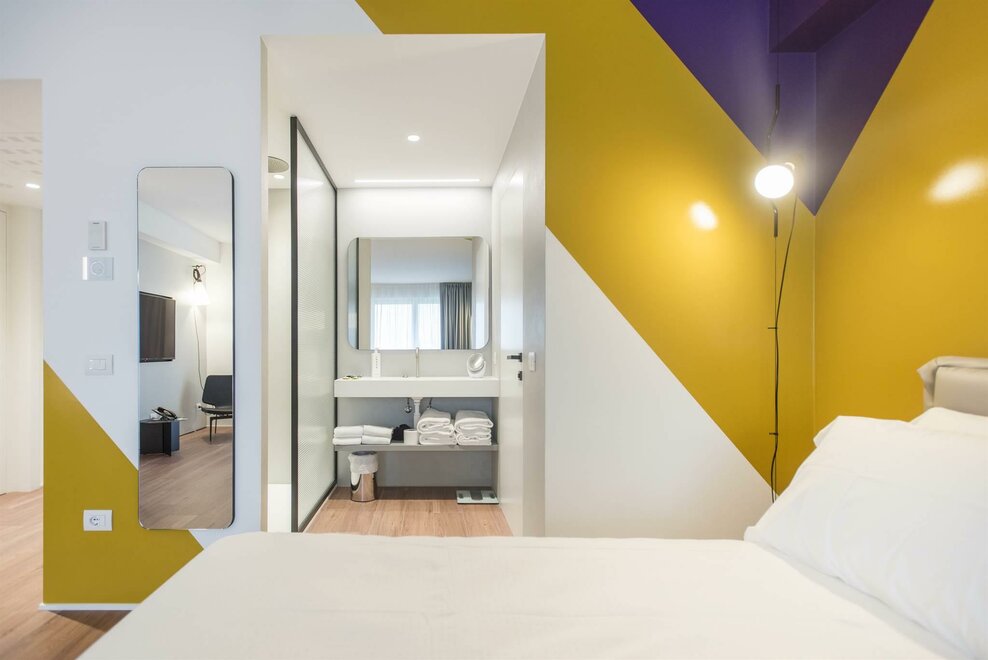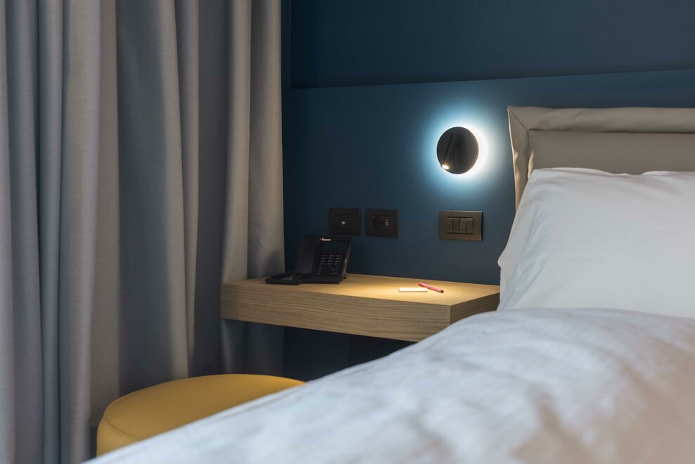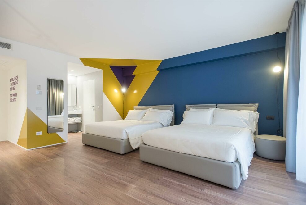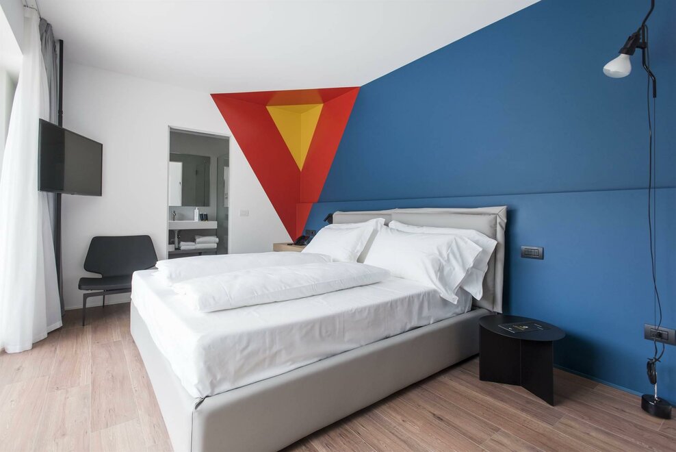Happy Room ist die Lösung für diejenigen, die Einfachheit, Komfort und Stil suchen. Hier finden Sie alles, was Sie für Ihre Erholung brauchen: ein großes Doppelbett mit Dorelan ReActive® Matratze, Flachbildfernseher, SMEG-Sportbar und Badezimmer mit Dusche.