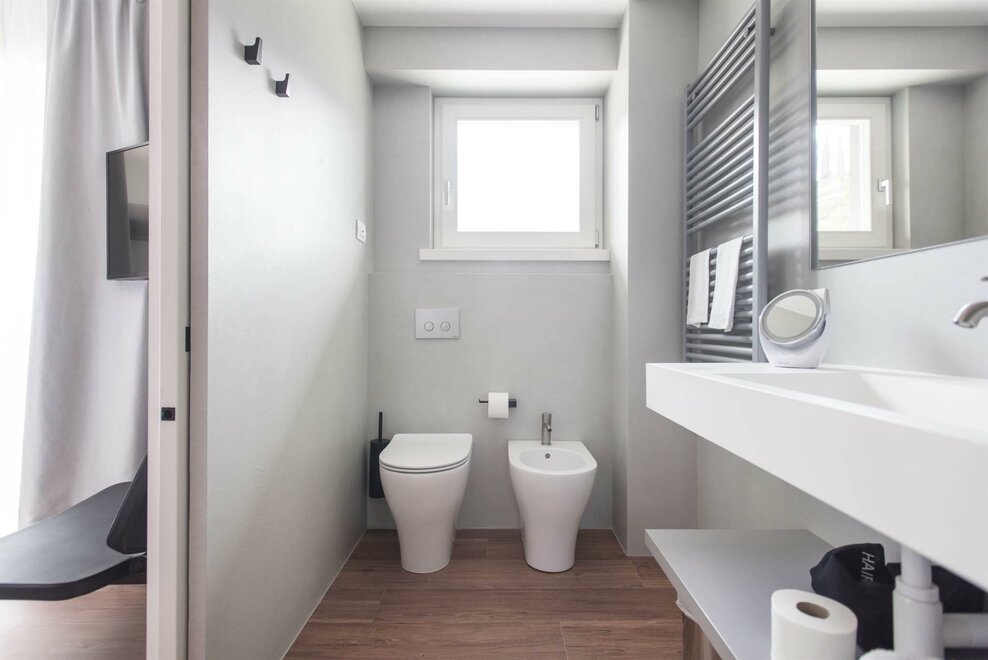 Das Bad ist in getrennte Bereiche für Dusche, Waschbecken, WC und Bidet unterteilt.