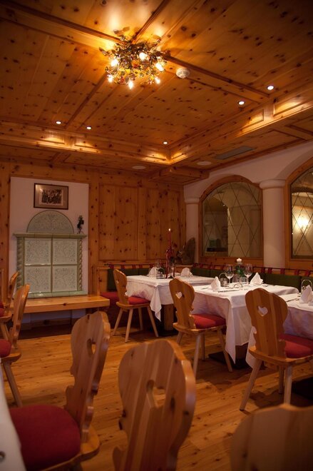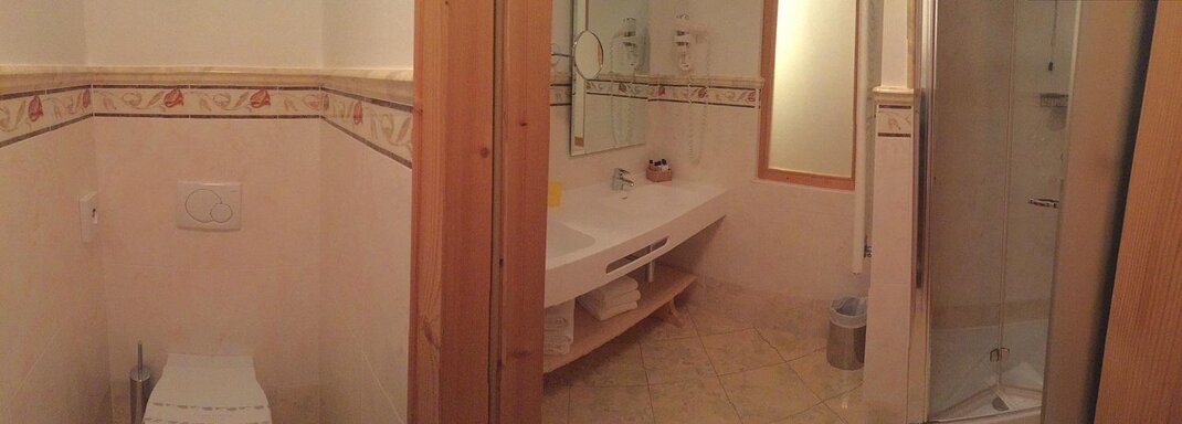 Der "Dreibett Zimmer" ist ein "Junior Suite" (ca. 22 – 24 m²), bei denen die Möglichkeit für ein drittes Zustellbett besteht. Alle sind ausgestattet mit Ankleideschrank, Trentiner Kachelofen, Sitzecke, Balkon oder Bogenfenster mit schönem Panoramablick. Die Badezimmer haben Dusche oder Wanne und separates WC.
