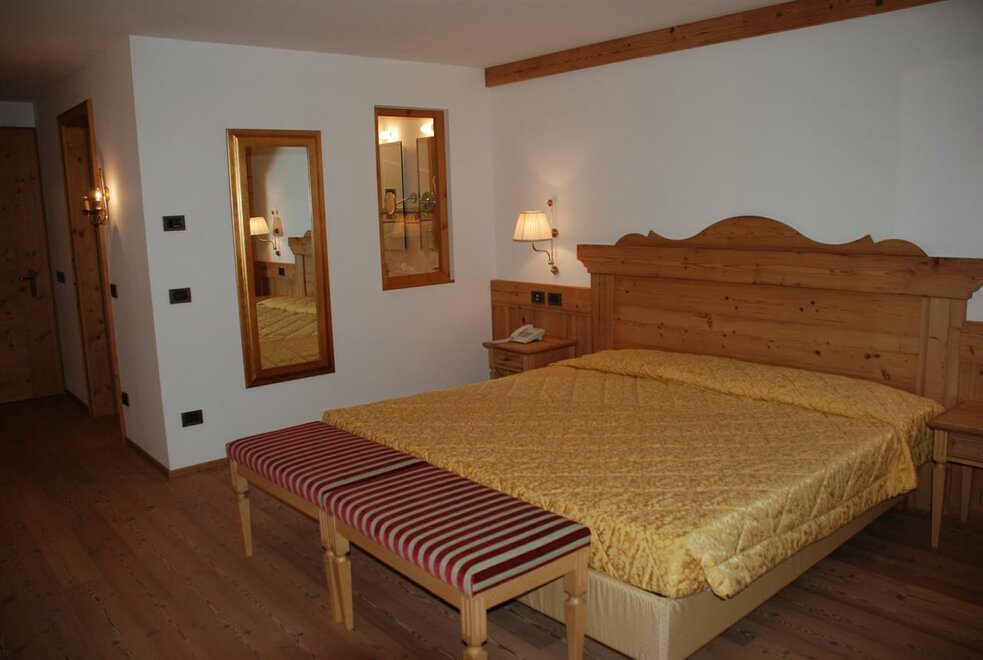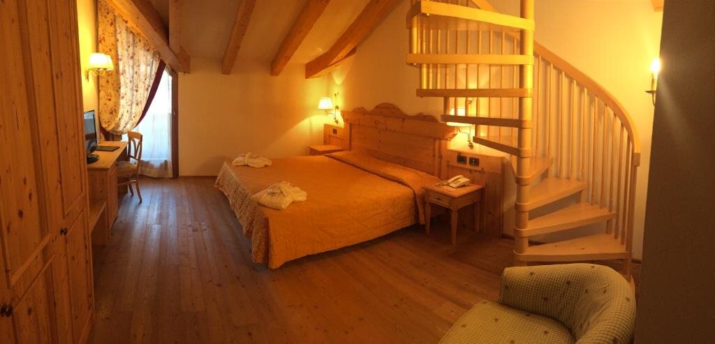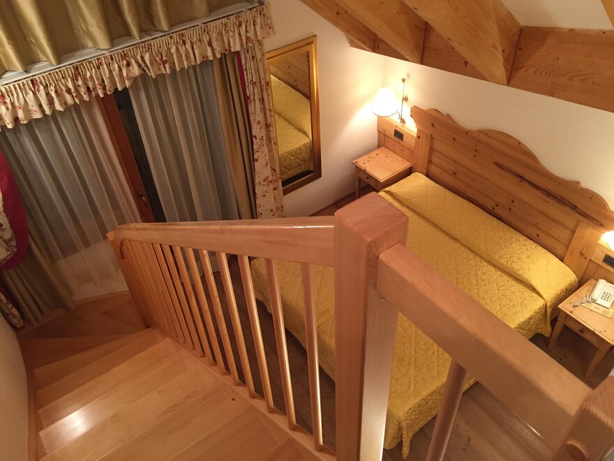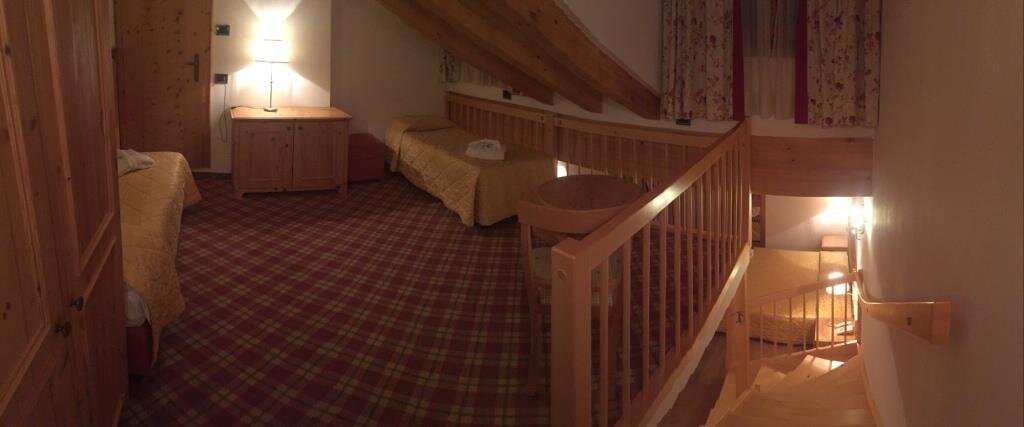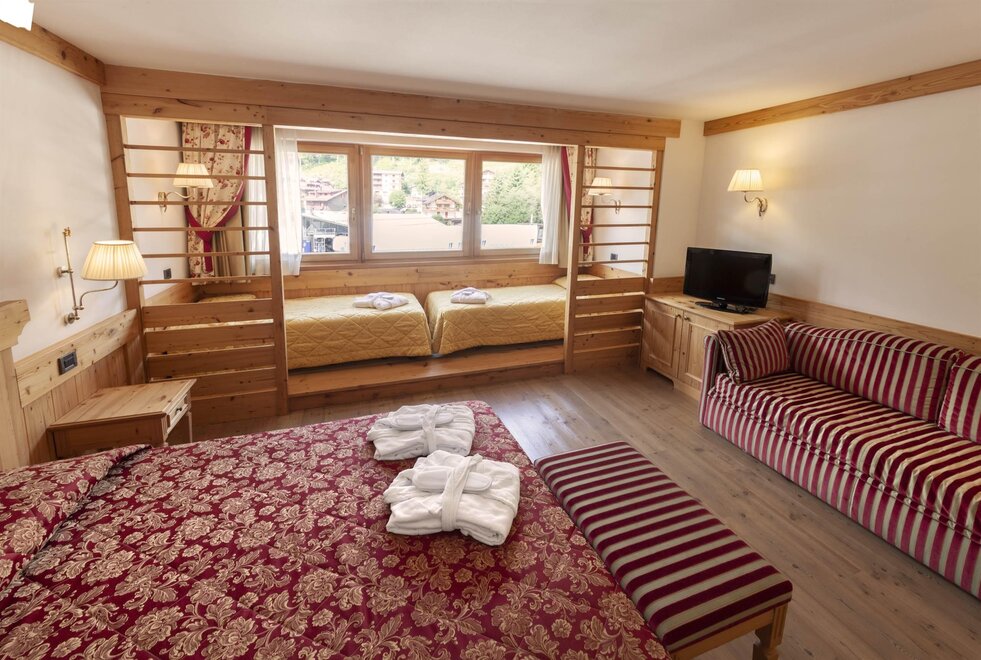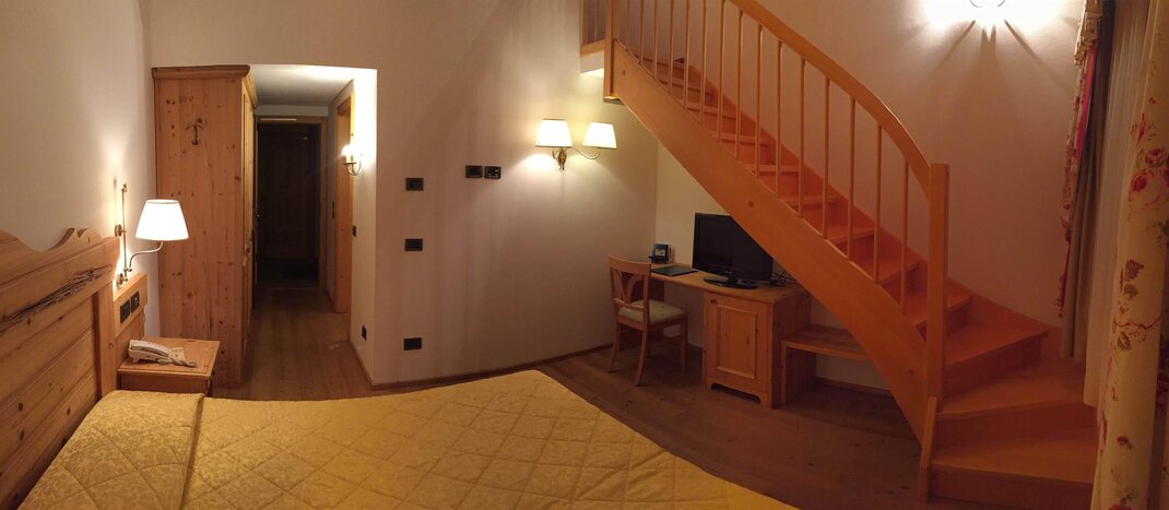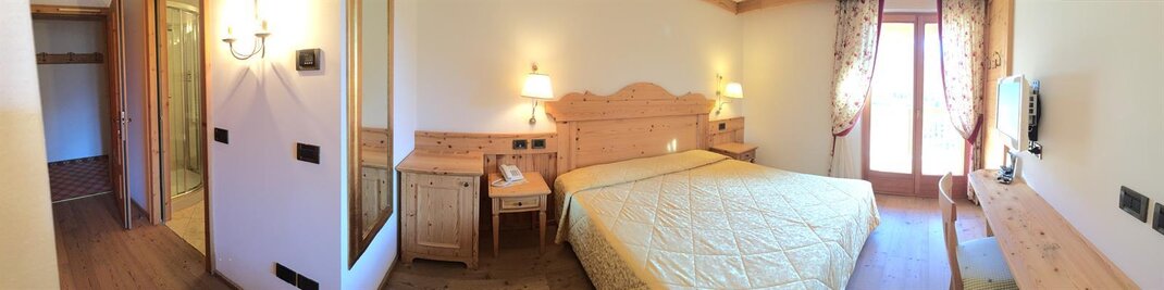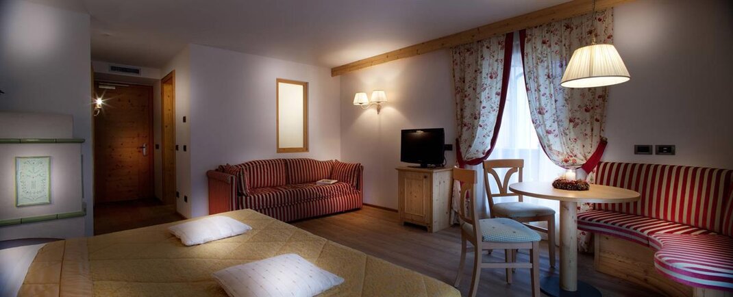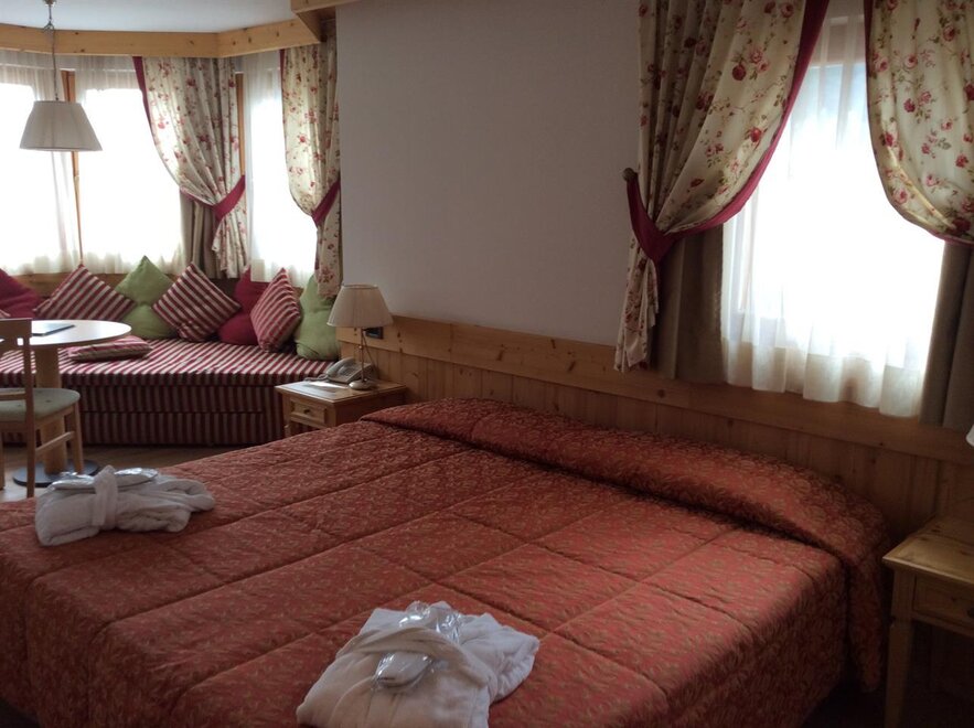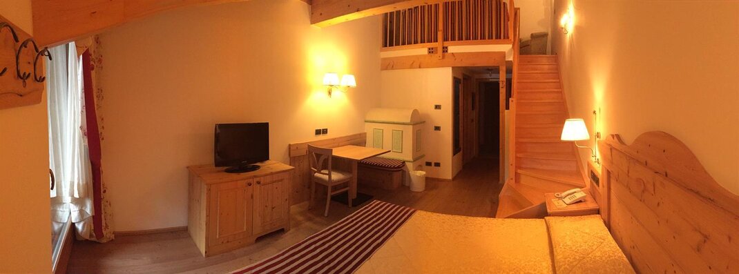Der "Vierbett Zimmer" ist ein "Junior Suite" (ca. 22 – 24 m²), bei denen die Möglichkeit für ein drittes und ein viertes Zustellbett besteht. Alle sind ausgestattet mit Ankleideschrank, Trentiner Kachelofen, Sitzecke, Balkon oder Bogenfenster mit schönem Panoramablick. Die Badezimmer haben Dusche oder Wanne und separates WC.