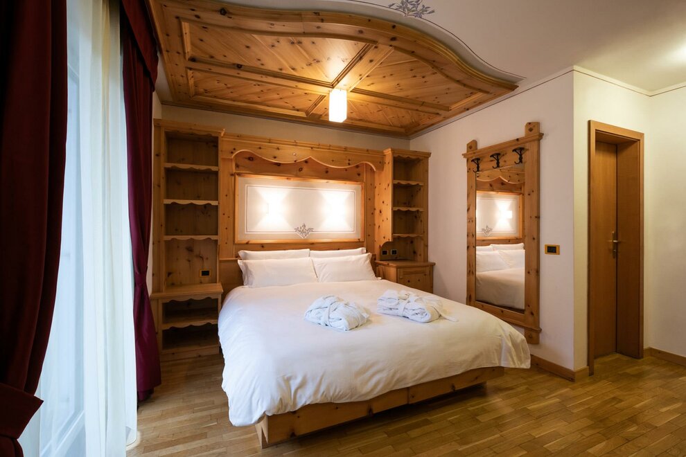 Suite von 30-35 Qm, in typischen Ladinstil und sehr gut eingerichtet, mit zwei Zimmern (Doppelbett oder getrennte Betten in einem Zimmer und ein Wohnzimmer, wo zwei Betten sein können). Die Suite hat einen Balkon, SAT-TV, Radio, Minibar, Safe, Telefon und Aussicht auf Sassolungo und Pordoi. Badezimmer mit Dusche, Haartrockner, Jacuzzi und Körperpflegeprodukte. Der Bademantel ist im Preis imbegriffen.