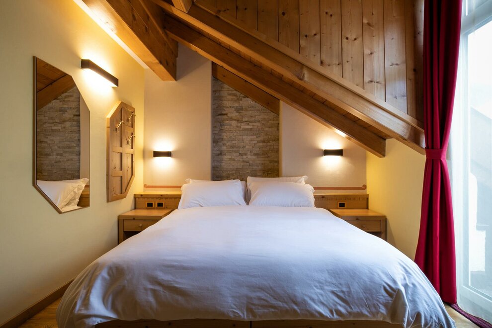Zimmer von 25 Qm, in typischen Bergstil und sehr gut eingerichtet, mit Balkon, SAT-TV, Radio, Minibar, Safe und Telefon. Badezimmer mit Dusche, Haartrockner und Körperpflegeprodukte. Bei Belegung von 3 Personen: Doppelbett oder getrennte Betten plus ein drittes Zusatzbett.