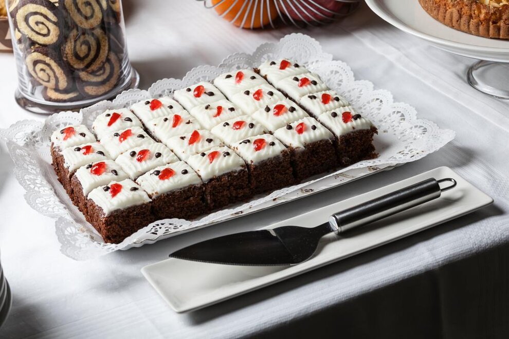 Jeden Morgen erwartet Sie ein Frühstücksbuffet mit süßen und herzhaften Produkten wie Kuchen, Joghurt, Wurst und Käse.