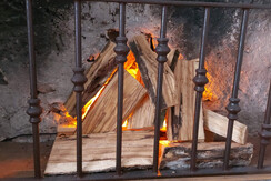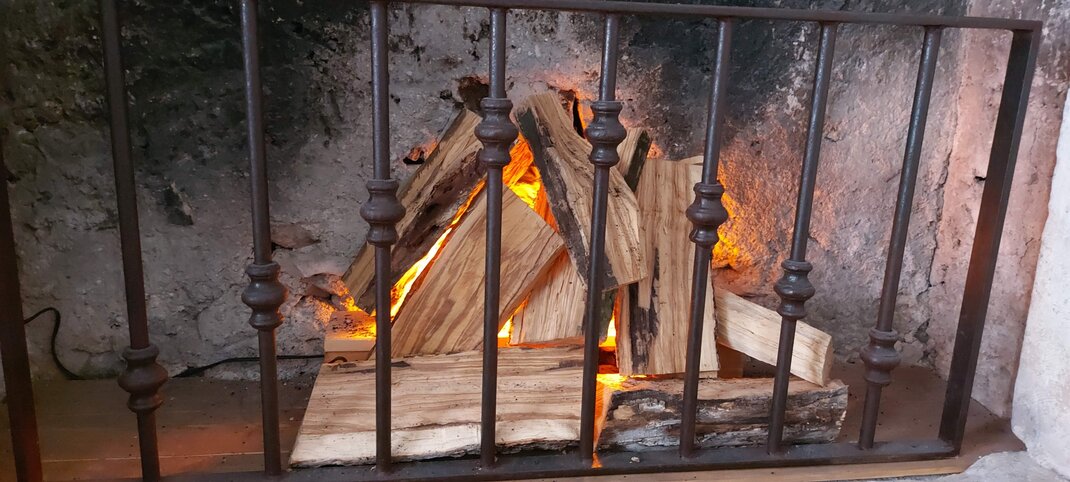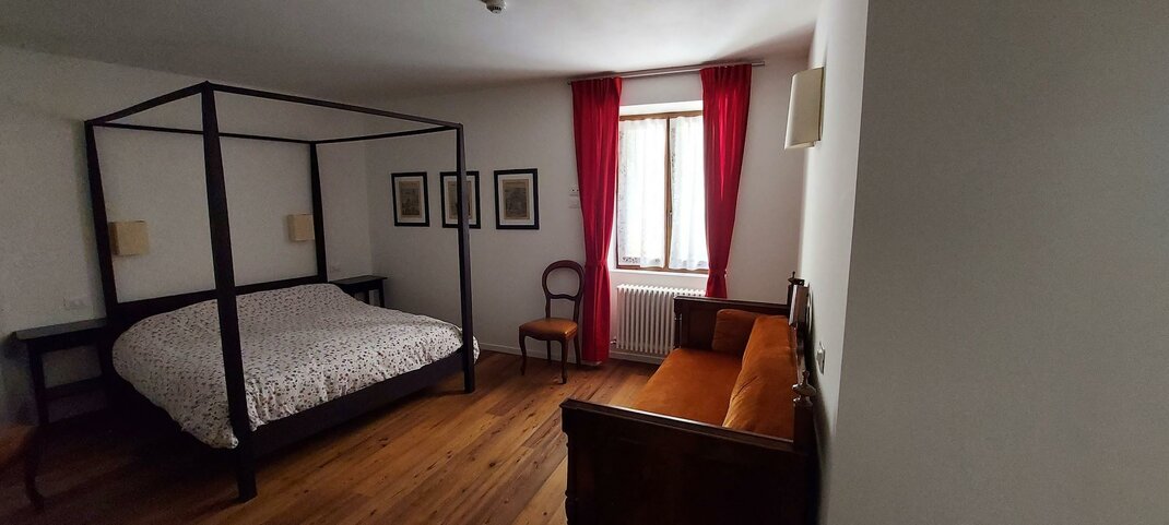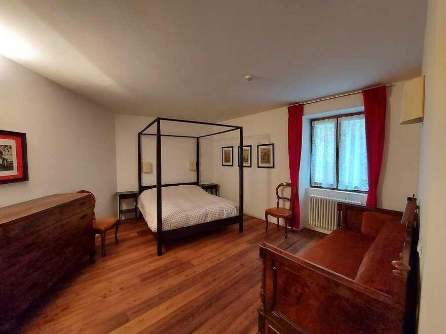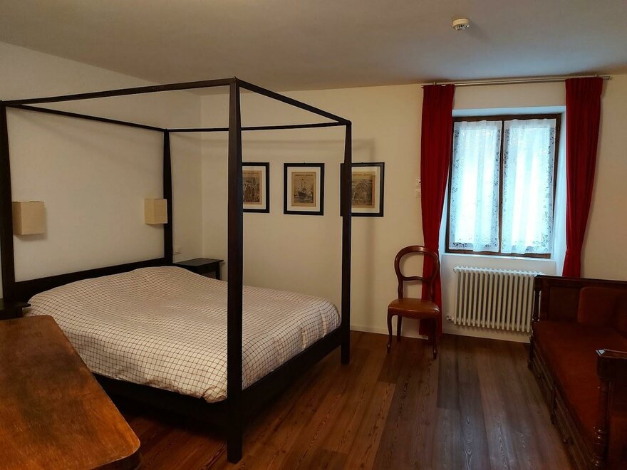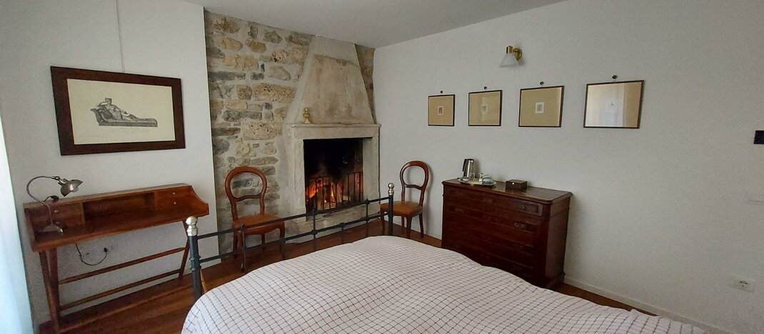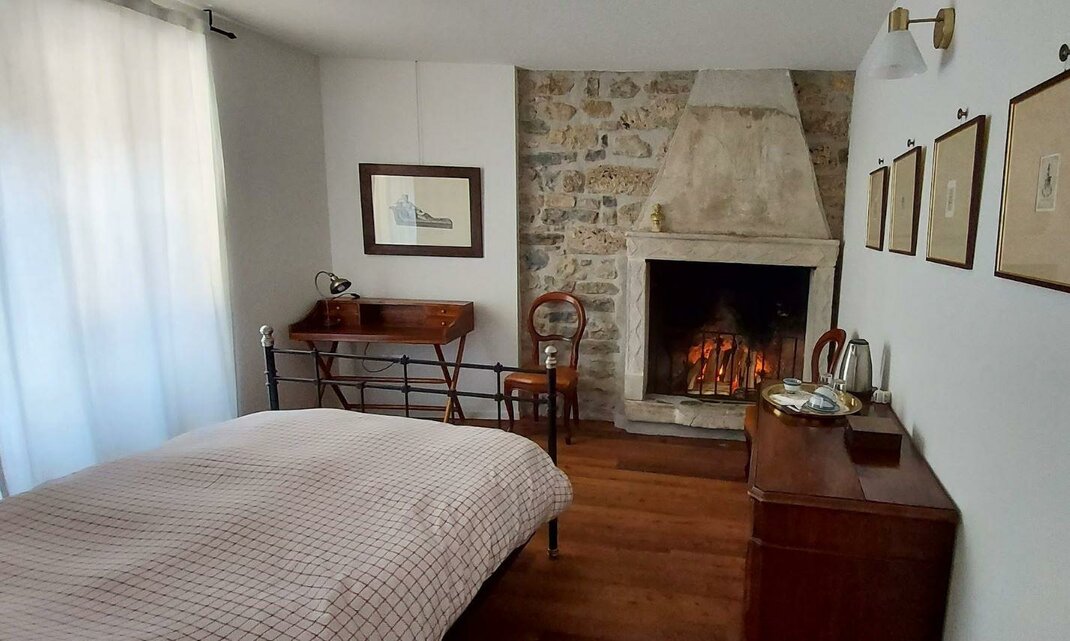 In diesem Zimmer steht ein Ehebett aus Eisen. Einladend ist der (heute geschlossene) Kamin aus altem Mamor.