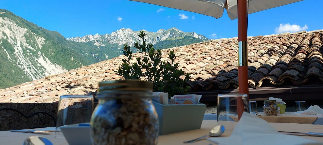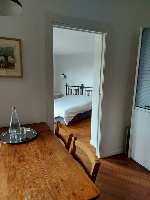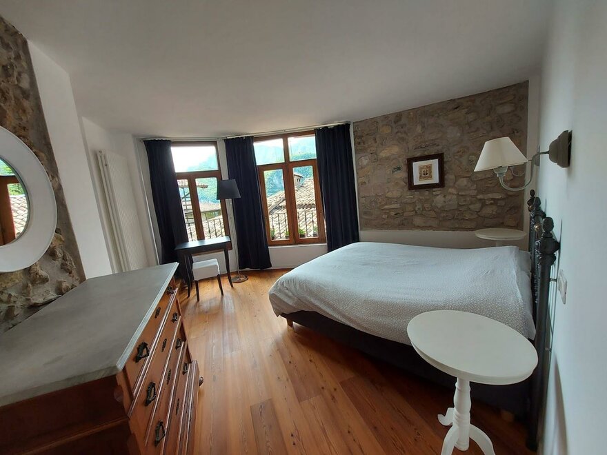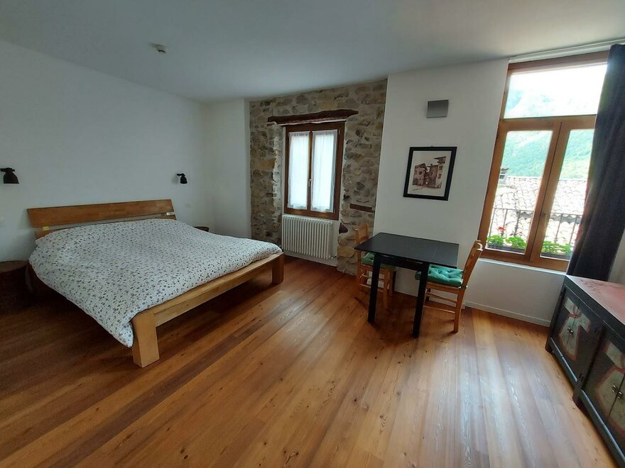 Bei der “Sonne” handelt es sich um eine Suite, die durch die großen Südfenster sehr hell ist. Man schaut über die Dächer mit den sonnengebleichten Ziegeln auf die Berglandschaft. Das Bett steht in einer vormals offenen Veranda.