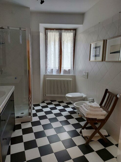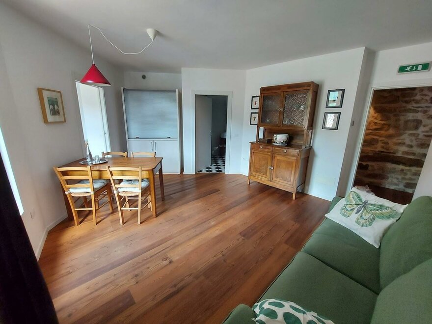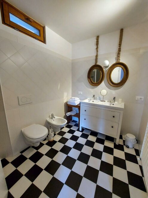 Eine kleine Küche und ein großes Bad sind vorhanden.Die Sonne, il sole, ist eine lichtdurchflutete Suite mit vielen Fenstern, die nach Süden auf die Dächer des Dorfes und die Berge blicken.