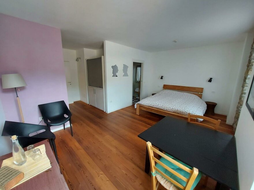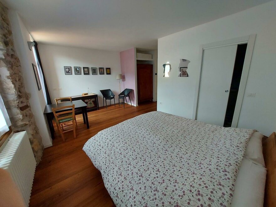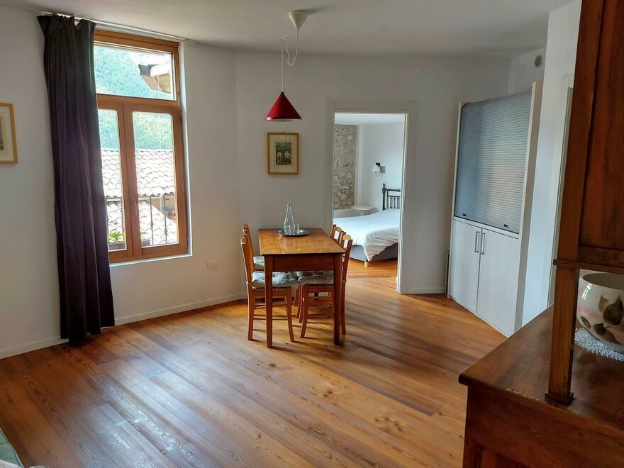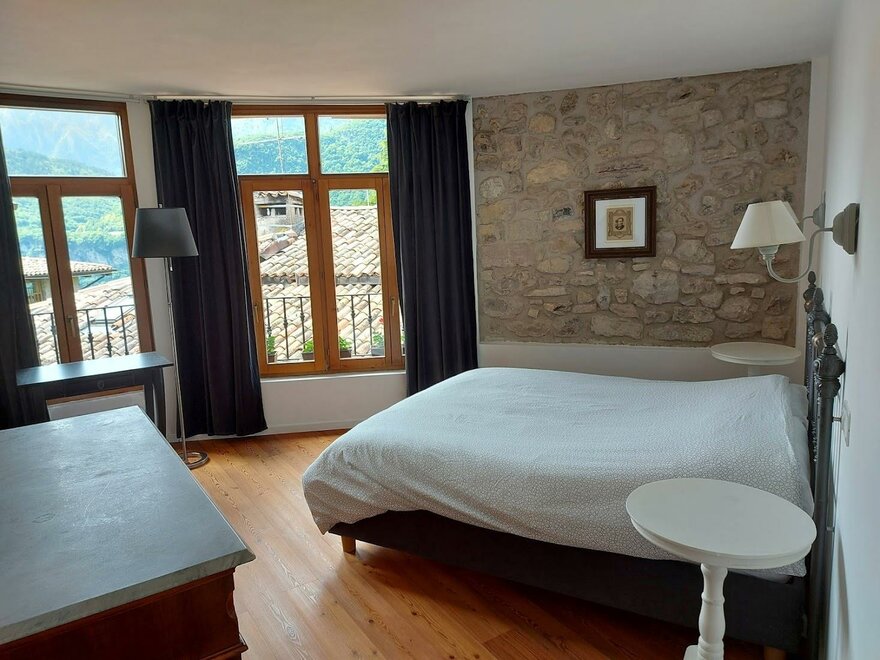 Dieses Zimmer ist mit Designmöbeln ausgestattet. Durch die Fenster blickt man über die sonnengebleichten alten Dachschindeln aus Terrakotta auf die Berge. Das Zimmer ha teine kleine Küche.Ausstattung Zimmer/Appartement