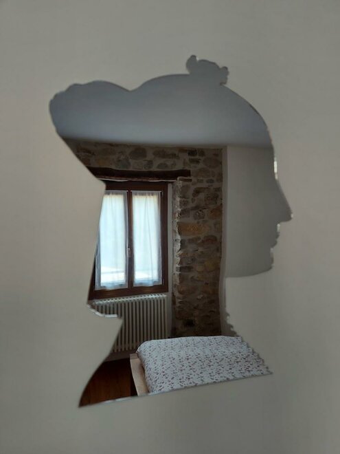 Die Fenster gehen zum kleinen Dorfplatz hin, der die meisten Tage verschlafen wirkt. Im August findet hier das Festival “Rustico Medioevo” statt. Die Bewohner des Zimmers können hier wie aus einer Ehrenloge die mittelalterlichen Spektakel und Musikdarbietungen verfolgen.Das Doppelzimmer mit einem Bett in halber Breite. Es ist ein traditionell gestaltetes Zimmer, mit einem Eisenbett und einem alten Kommode, wo ein typischer Kamin der Bauernhäuser erhalten geblieben ist. Die Restaurierung hat eine blumenförmige Dekoration freigelegt, die in den Kamin eingraviert ist.
