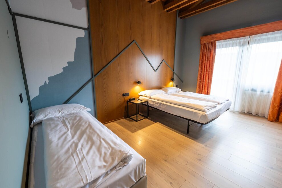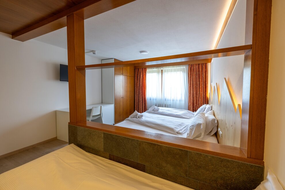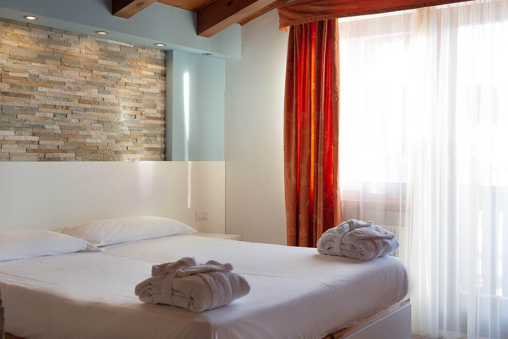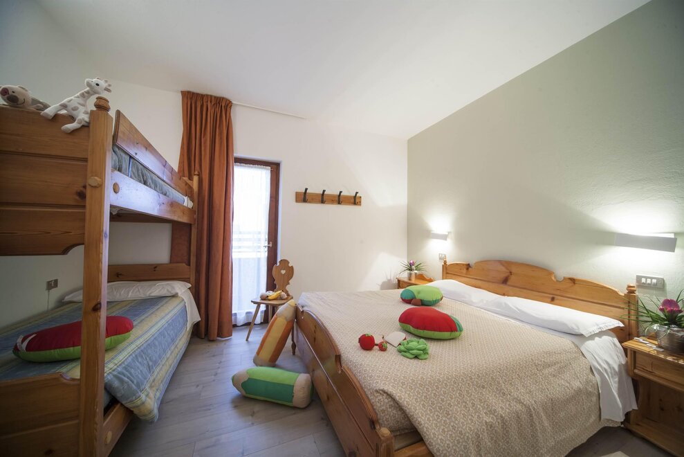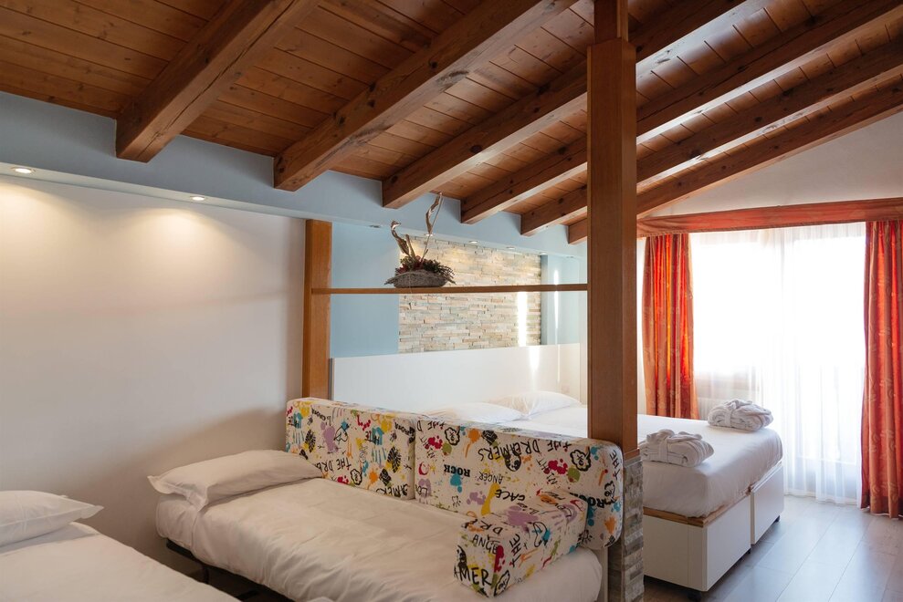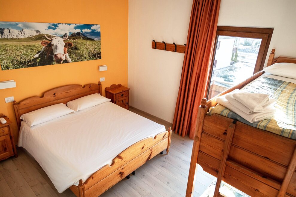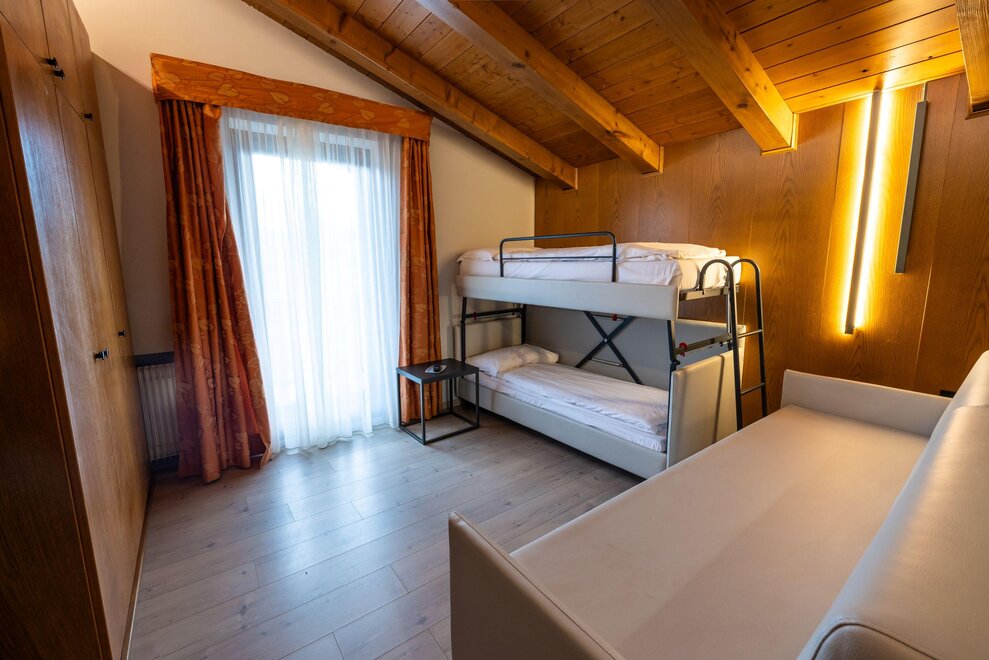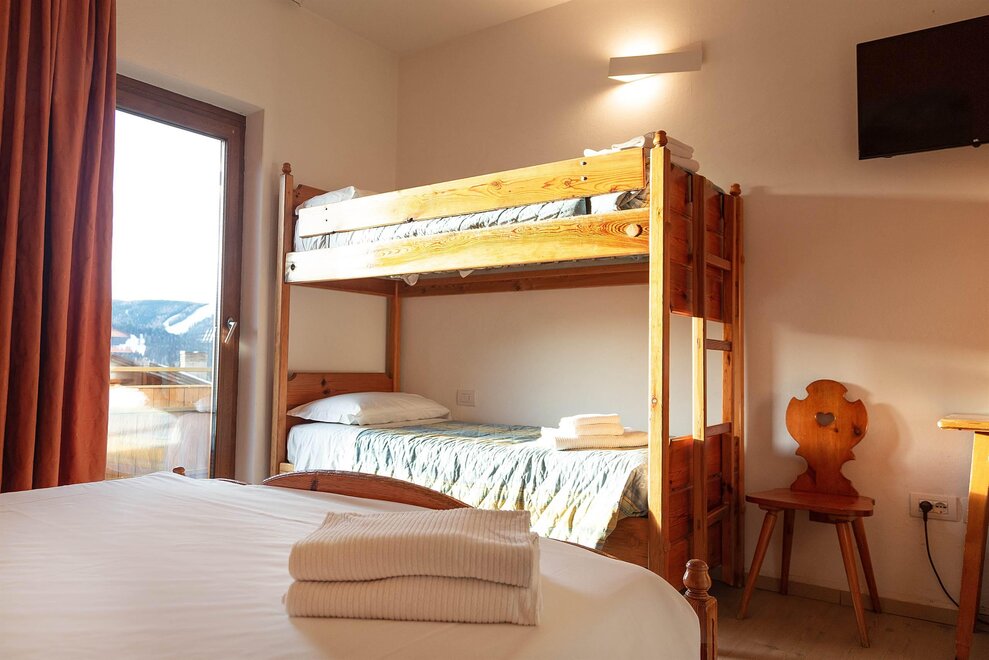 CampanulaEs ist ein Vierbettzimmer mit einem Doppelbett und einem Etagenbett; ausgestattet mit Parkett hat es eine Fläche von etwa 16 Quadratmetern und verfügt über einen Balkon, der sowohl im Sommer als auch im Winter von Familien sehr geschätzt wird. Einige dieser Zimmer können Personen mit eingeschränkter Mobilität aufnehmen. Die Zimmer Campanula sind mit allen Annehmlichkeiten ausgestattet, wie Satelliten-TV, Haartrockner, Safe und Minibar.