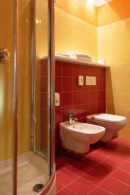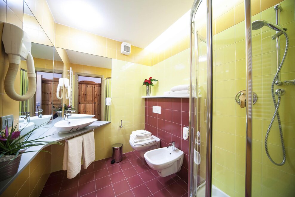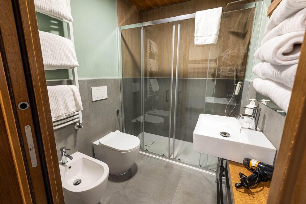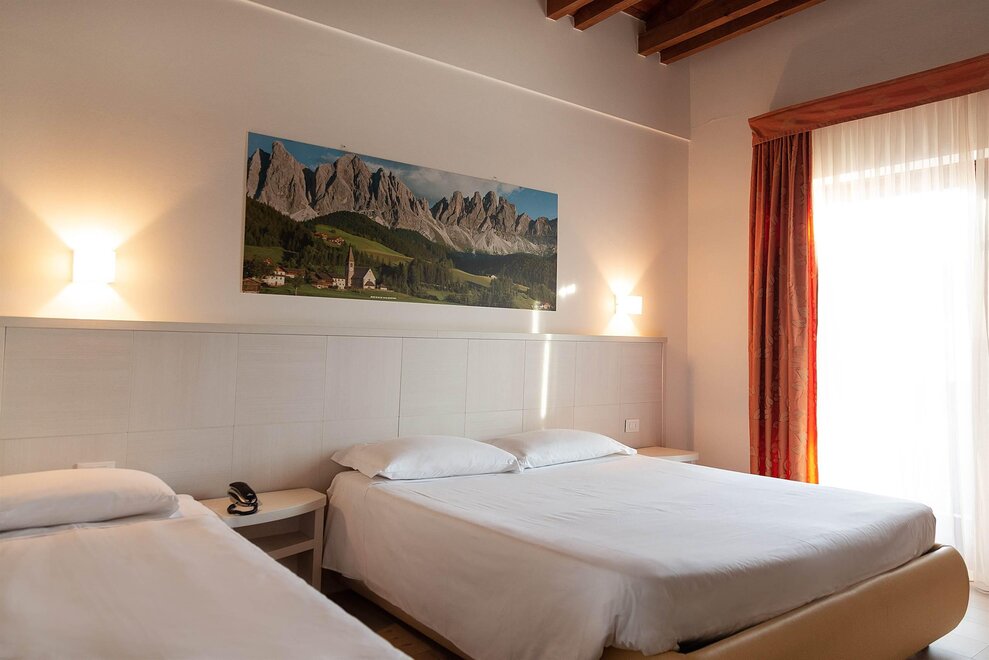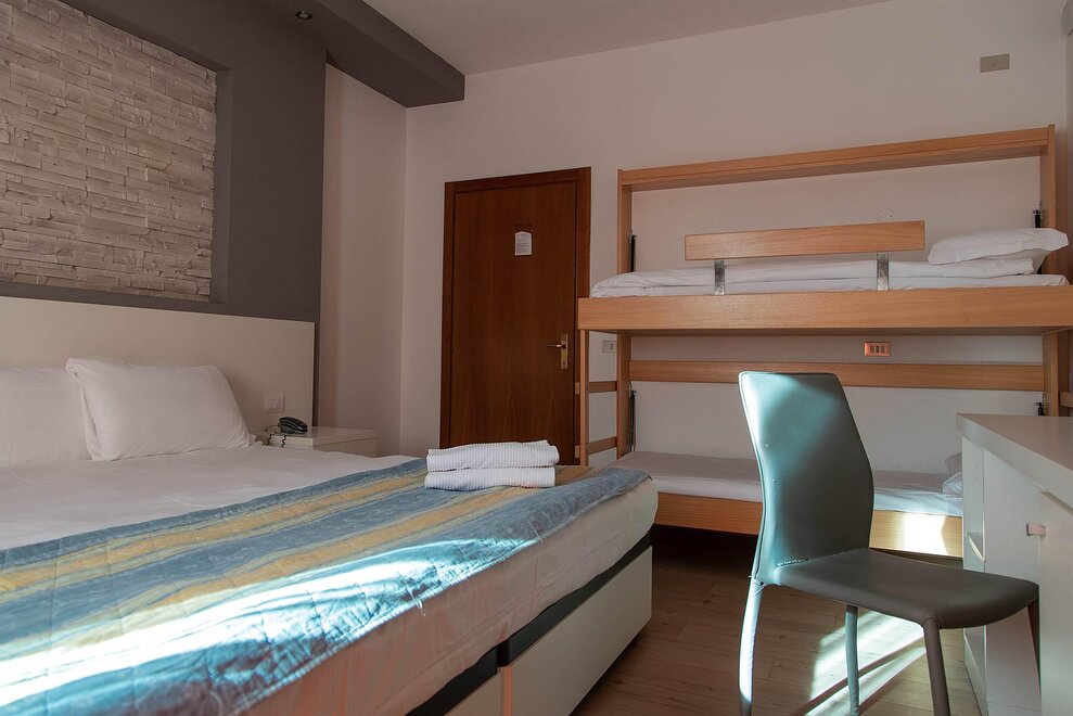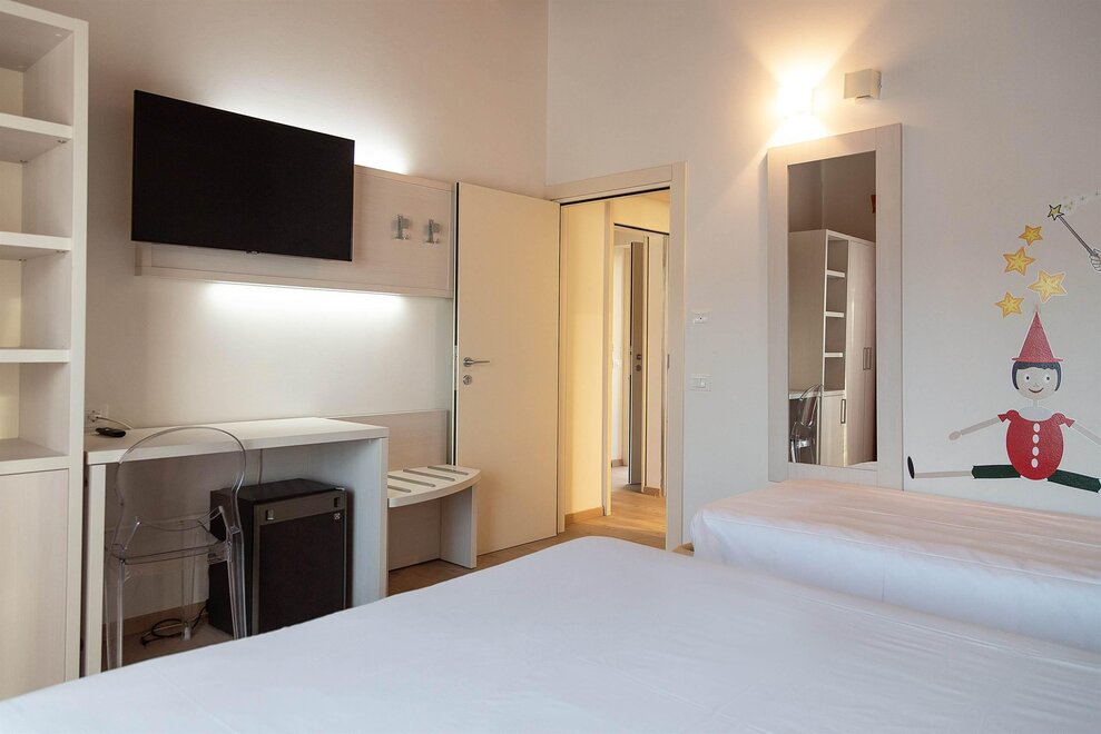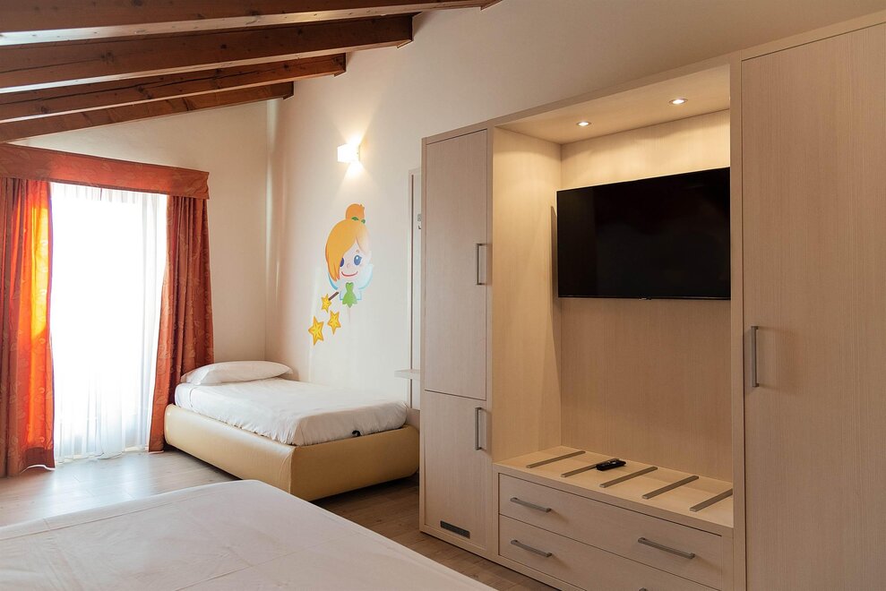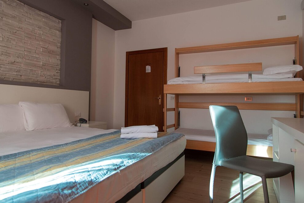 CampanulaEs ist ein Vierbettzimmer mit einem Doppelbett und einem Etagenbett; ausgestattet mit Parkett hat es eine Fläche von etwa 16 Quadratmetern und verfügt über einen Balkon, der sowohl im Sommer als auch im Winter von Familien sehr geschätzt wird. Einige dieser Zimmer können Personen mit eingeschränkter Mobilität aufnehmen. Die Zimmer Campanula sind mit allen Annehmlichkeiten ausgestattet, wie Satelliten-TV, Haartrockner, Safe und Minibar.