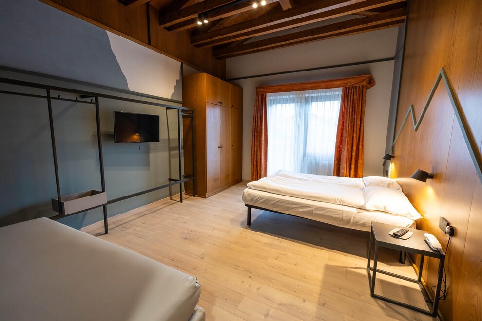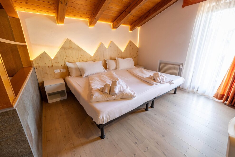 Stella Alpina KingDiese Zimmer befinden sich im Chalet 3, haben eine durchschnittliche Fläche von etwa 24 Quadratmetern und sind alle nach Süden ausgerichtet. Die Zimmer Stella Alpina King sind mit Parkett ausgestattet und bieten Platz für Familien von bis zu 4 Personen, wodurch sie ideal für Familien oder Freundesgruppen sind. Einige unserer geräumigeren Zimmer bieten Platz für bis zu 5 Personen. Dieser Zimmertyp besteht aus 1 King-Size-Bett und 2 Einzelbetten, während das Zimmer für 5 Personen 1 King-Size-Bett, 1 Etagenbett und 1 Einzelbett hat. Einige der Zimmer Stella Alpina King verfügen nicht über einen Balkon. Diese Zimmer sind nicht mit dem Aufzug erreichbar. Die Zimmer sind mit allen Annehmlichkeiten ausgestattet, einschließlich eines Bademantel-Sets für Erwachsene.