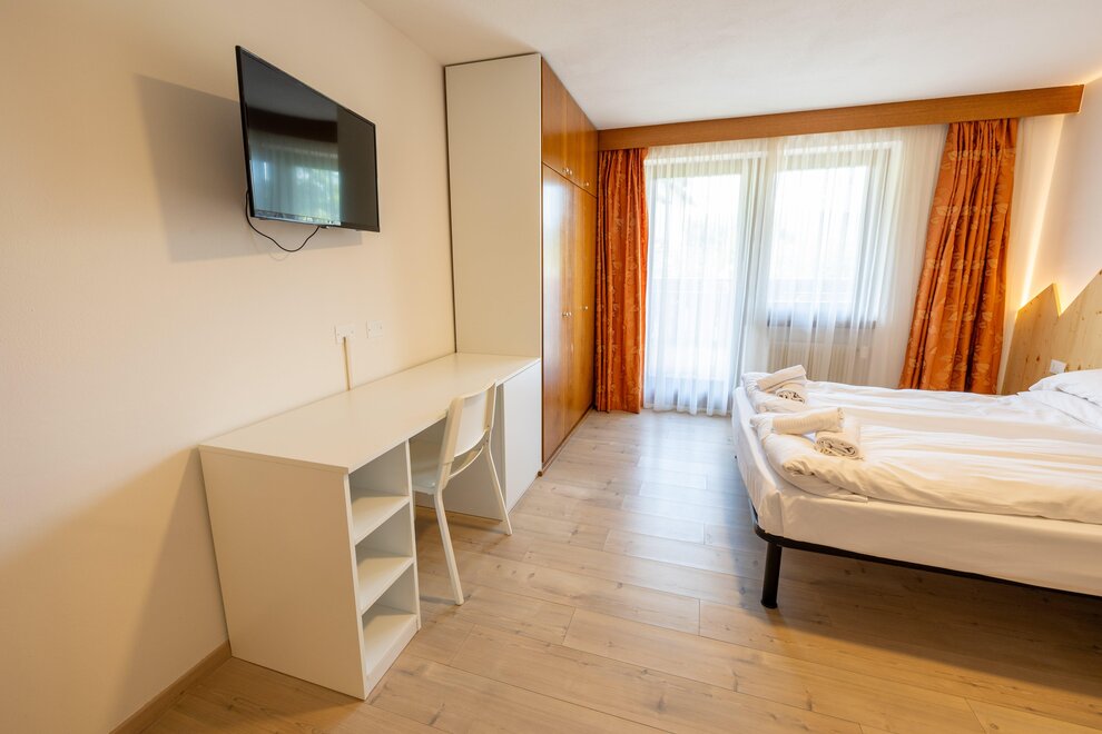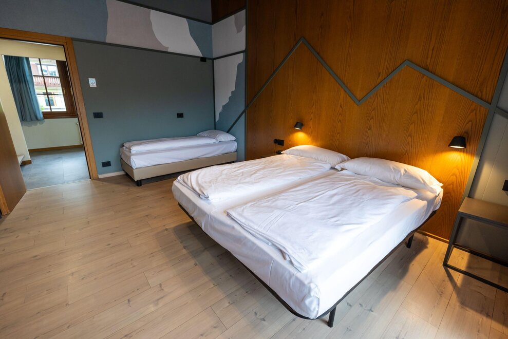 Stella AlpinaDiese Zimmer befinden sich im Chalet 3, haben eine durchschnittliche Fläche von etwa 20 Quadratmetern und sind alle nach Süden ausgerichtet. Die Zimmer Stella Alpina sind mit Parkett ausgestattet und bieten Platz für Familien mit zwei Kindern. Die Zimmer Stella Alpina verfügen über ein Doppelbett und ein Etagenbett oder ein Doppelbett und Einzelbetten für das Dreibettzimmer. Diese Zimmer haben einen Balkon, sind jedoch nicht mit einem Aufzug erreichbar.