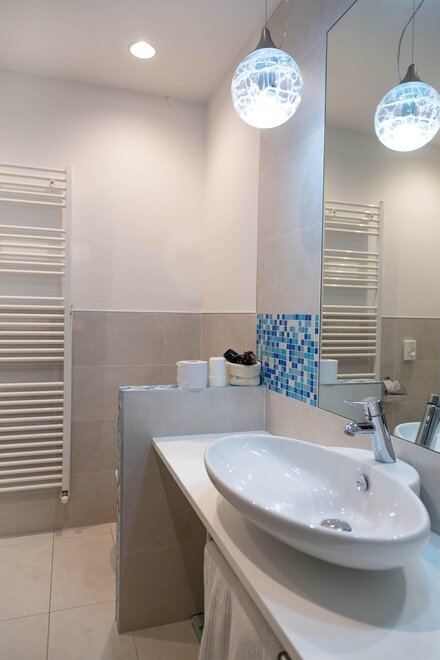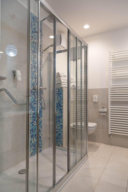 Das Zimmer bietet allen Komfort, einschließlich eines Bademantelsets für Erwachsene und einer überdachten Garage.Dieses Zimmer ist nicht mit dem Aufzug erreichbar.