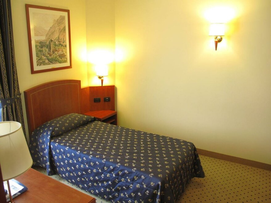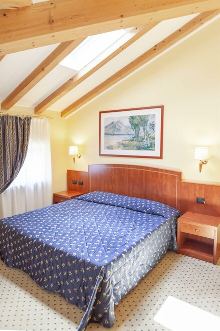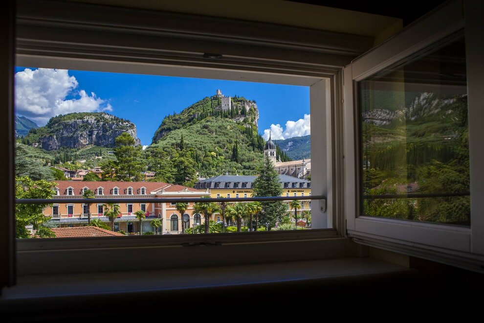 Gräumiges Doppelzimmer mit wunderbarer Sicht auf die Burg von Arco. Elegant eingerichtet (18 mq), verfügt über „King Size“ Bett (Mt. 2,00 X 2,00), Flachbild 32“ SAT TV, WI FI frei, Klimaanlage, Schreibtisch, Kühlschrank, Safe,Tel. und Schallschutzfenster.