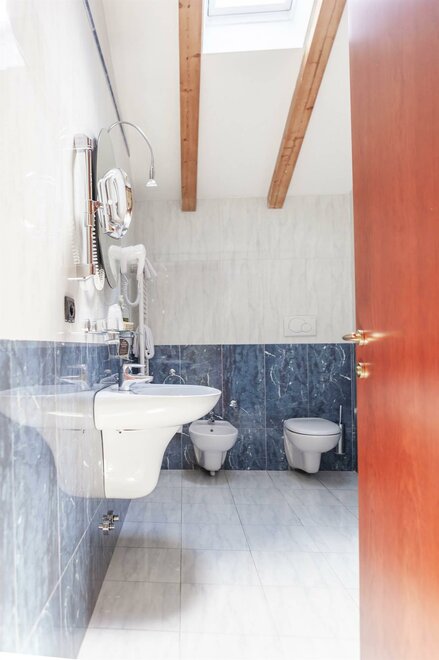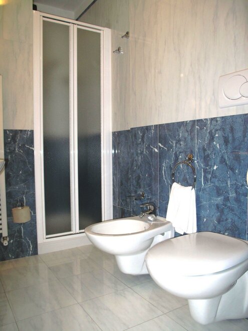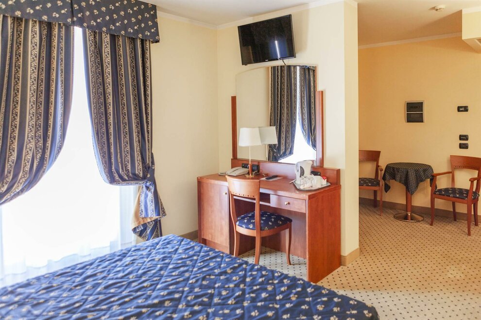 Gräumiges Doppelzimmer, 19-21 mq, elegant eingerichtet, verfügt über „King Size“ Bett (Mt. 2,00 X 2,00) und Einzelbett, Flachbild 32“ SAT TV, WI FI frei, Klimaanlage, Schreibtisch, Kühlschrank, Safe, Tel. und Schallschutzfenster.