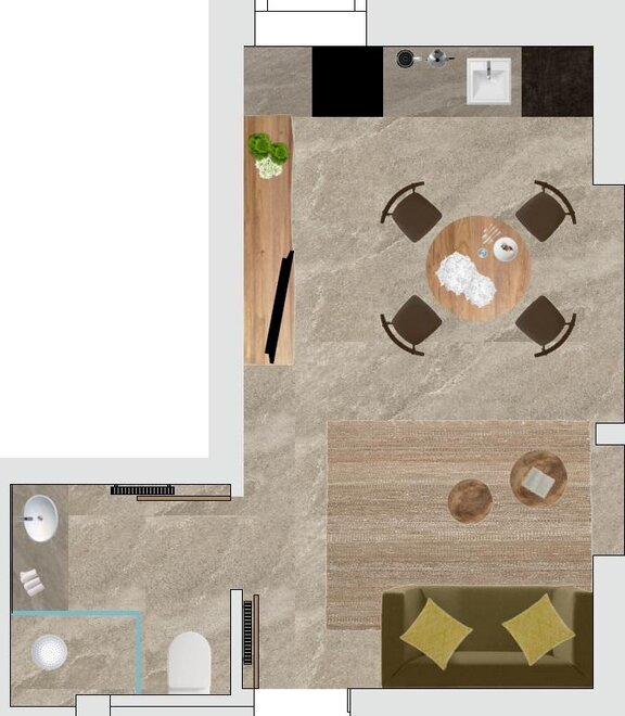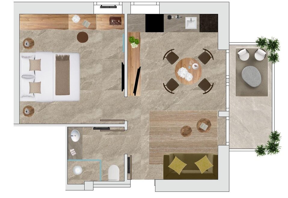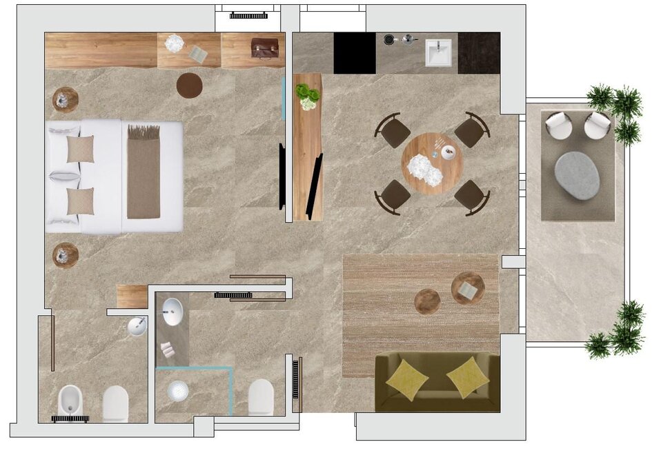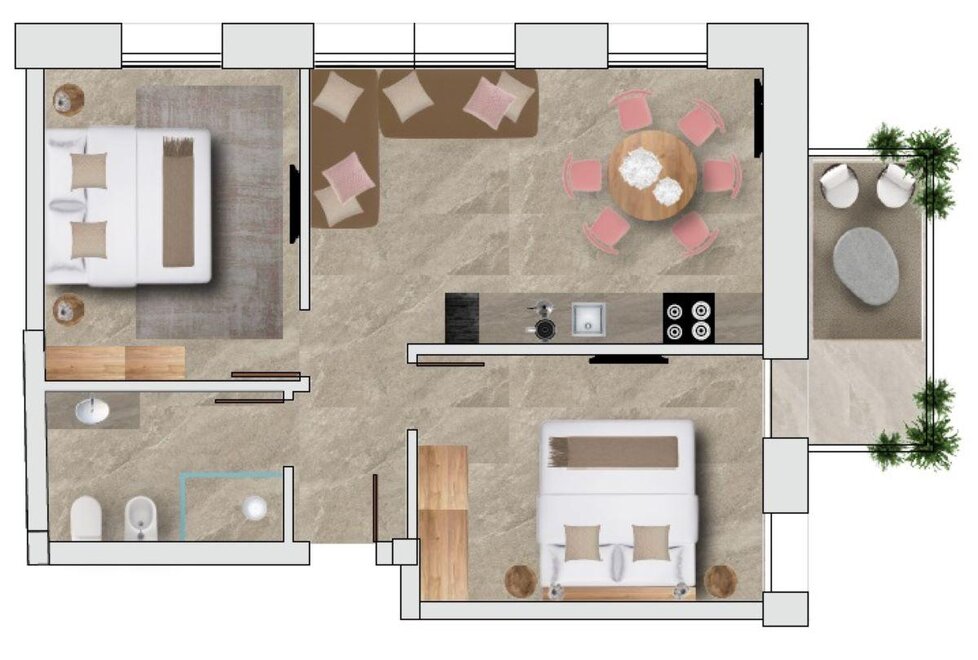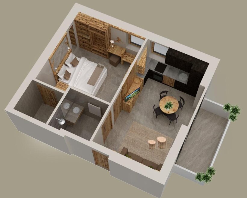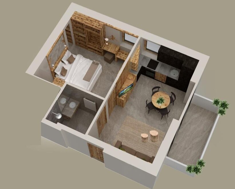 Komfortable 36 m² große Wohnung für 2-4 Personen mit 1 Schlafzimmer, 1 Badezimmer, Küche und Wohnzimmer mit Schlafsofa für 2 Personen, Balkon oder nicht abgetrennter Terrasse