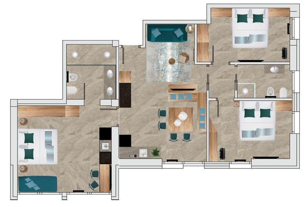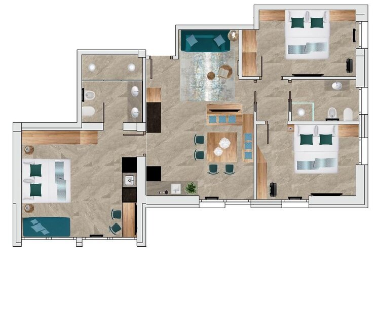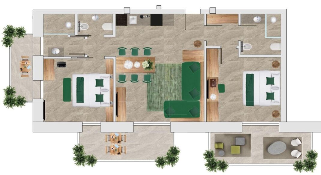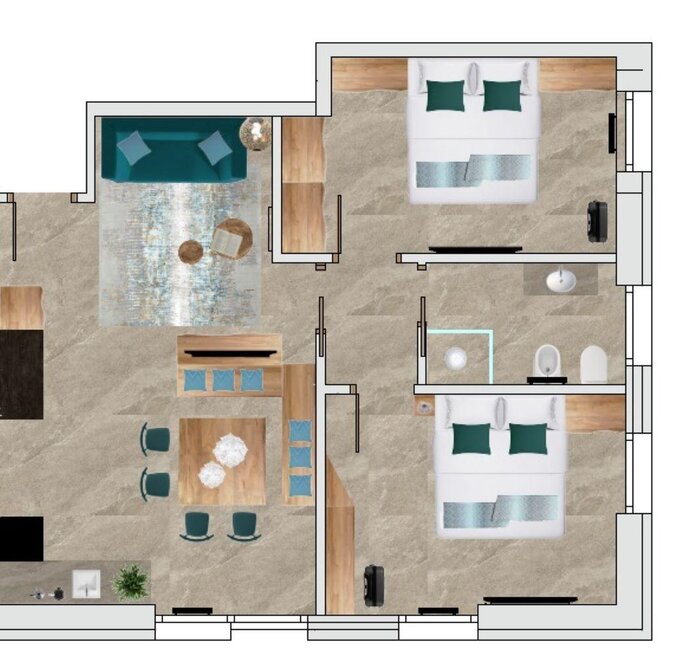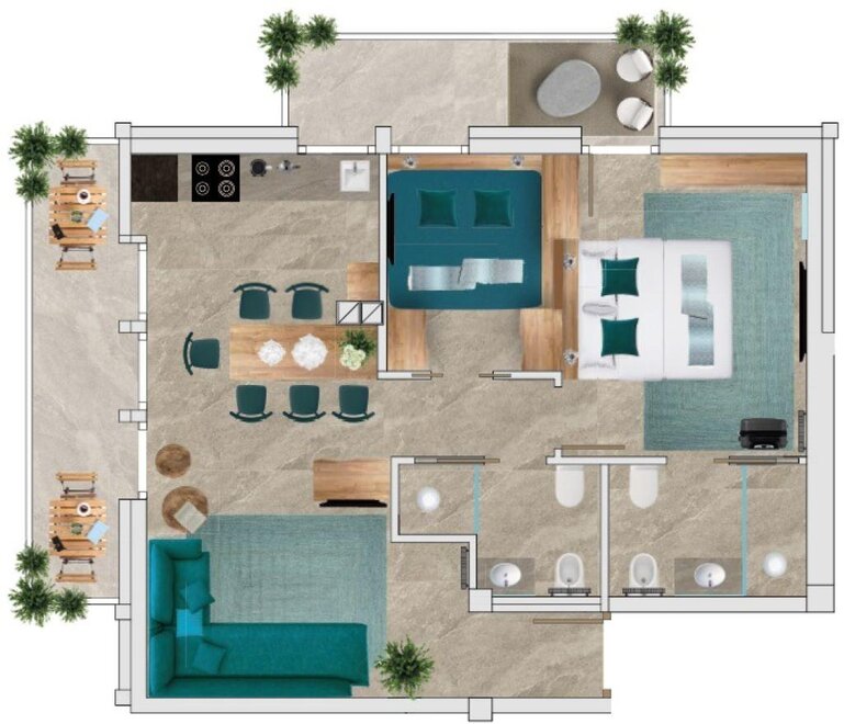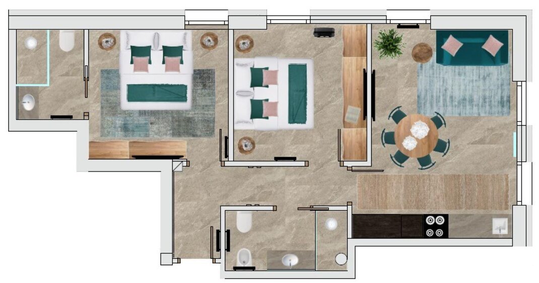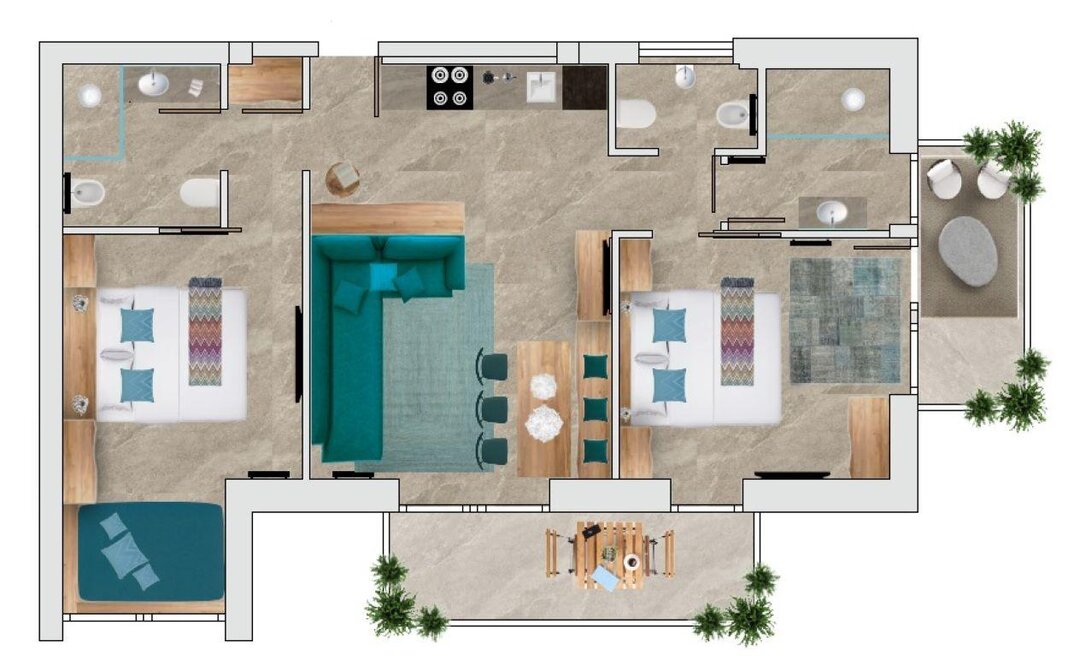 Gemütliche Dreizimmerwohnung von 65 m² für 4-6 Personen mit zwei Doppelzimmern, zwei Badezimmern, Küche und Wohnzimmer mit Schlafcouch für zwei Personen und Balkon.