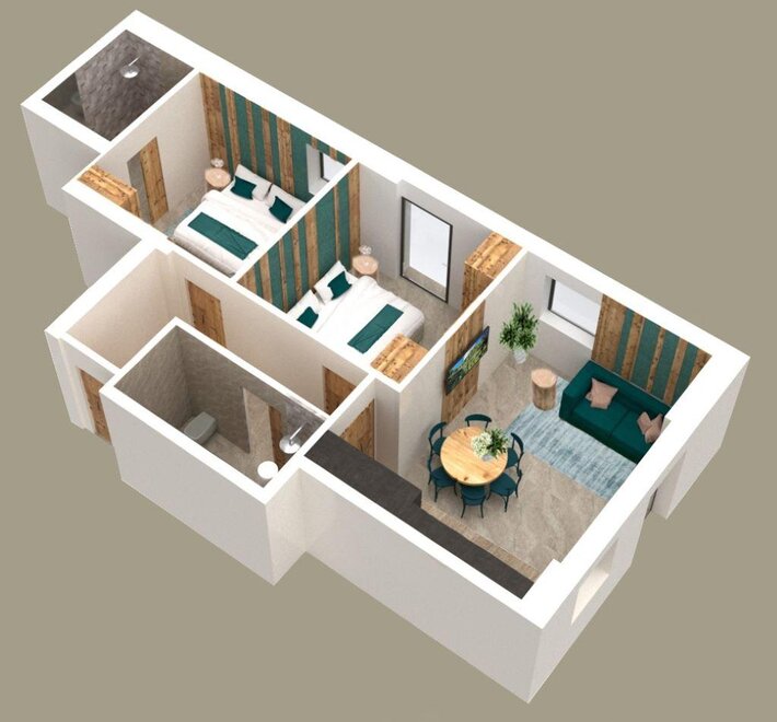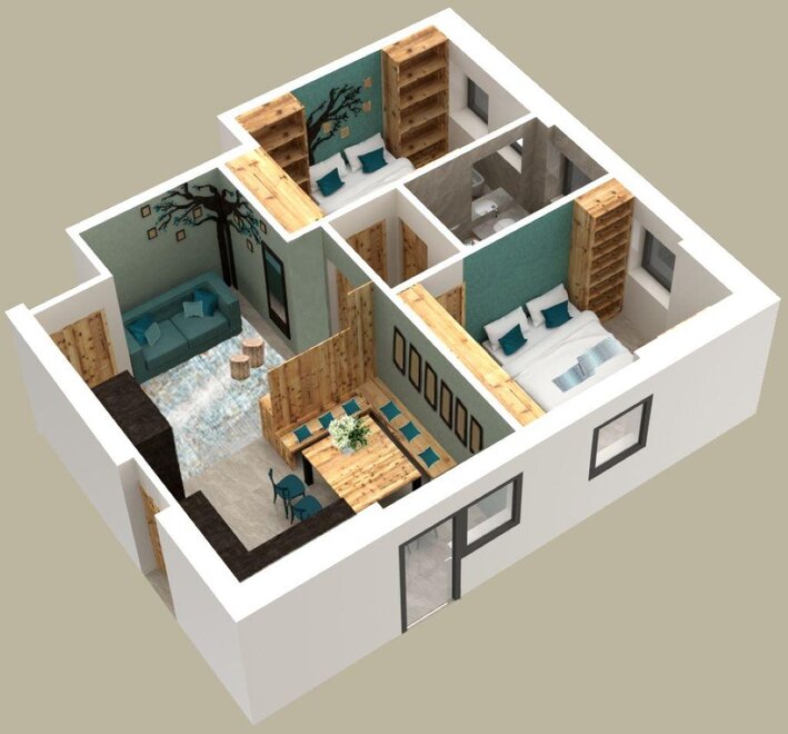 Gemütliche Dreizimmerwohnung von 63 m² für 5-7 Personen mit einem Doppelzimmer, einem Doppelzimmer mit Schlafcouch für eine Person, zwei Badezimmern, Küche und Wohnzimmer mit Schlafcouch für zwei Personen und Balkon.