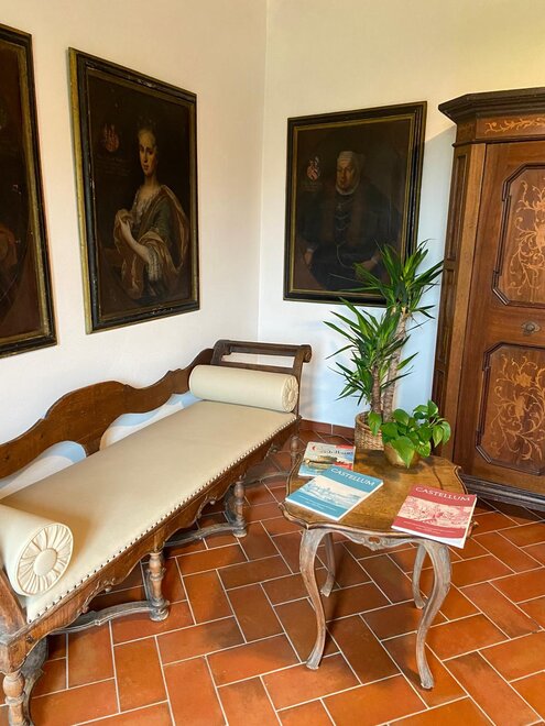 Helles Zimmer im ersten Stock, erreichbar über die originale Treppe des Palastes. Das Zimmer verfügt über ein französisches Bett und ein Fenster mit Panoramablick. Das Badezimmer hat eine geräumige Dusche und einen privaten Balkon mit Blick auf Schloss Noarna.