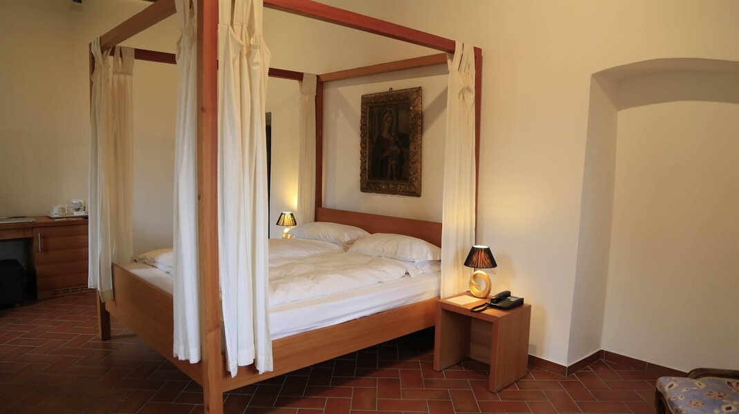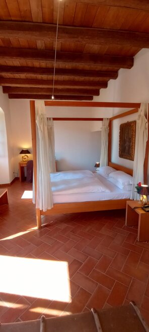Helles Zimmer im ersten Stock, erreichbar über die originale Treppe des Palastes. Das Bett ist ein Himmelbett mit Fensterfronten mit Panoramablick. Das Bad hat eine Badewanne mit Duscharm.