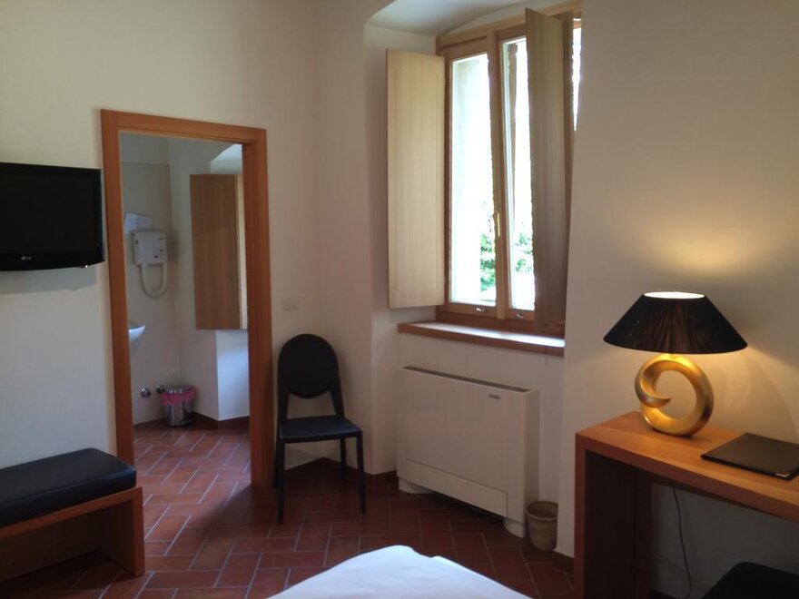 Helle Zimmer im ersten Stock, erreichbar über die originale Treppe des Palastes. Das Bett ist ein Doppelbett und es gibt ein Fenster mit Panoramablick sowohl vom Schlafzimmer als auch vom Badezimmer mit Badewanne und Duschkopf.