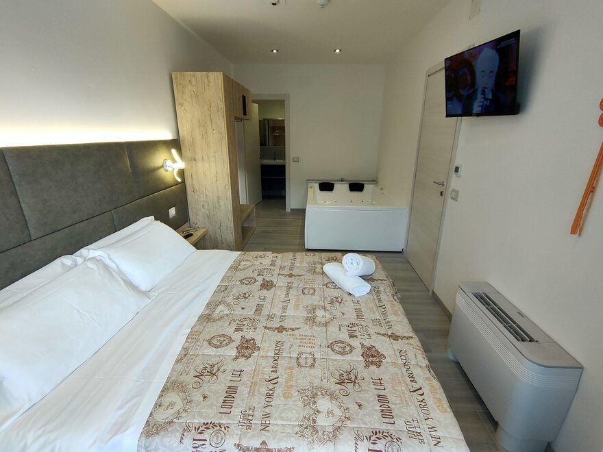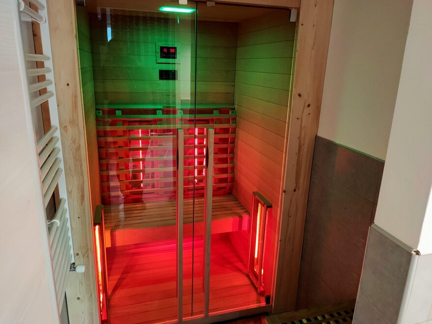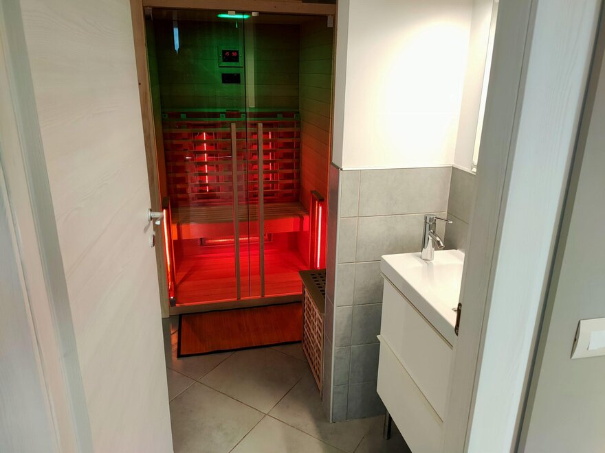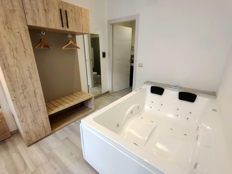 Es handelt sich um Zweizimmerwohnungen, die sich ideal für Paare oder Familien eignen, die sich entspannen möchten. Sie verfügen über einen großen Essbereich im Innen- und Außenbereich mit voll ausgestatteter Küche. Im Hauptschlafzimmer gibt es ein Badezimmer mit Kingsize-Dusche und eine EXKLUSIVE WHIRLPOOL-BADEWANNE für zwei Personen. Im Tagesbereich befindet sich ein WELLNESS-Raum mit Infrarotsauna für zwei Personen. Für Kinder steht ein ausklappbares Etagenbett zur Verfügung.