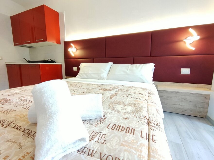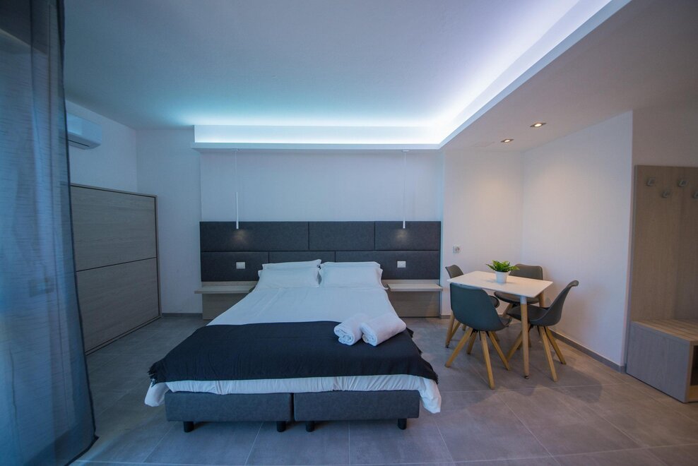 Die Studios befinden sich im zweiten Stock und verfügen über einen Wohnbereich mit Küchenzeile und Doppelbett. Für Kinder steht ein Klappbett zur Verfügung.