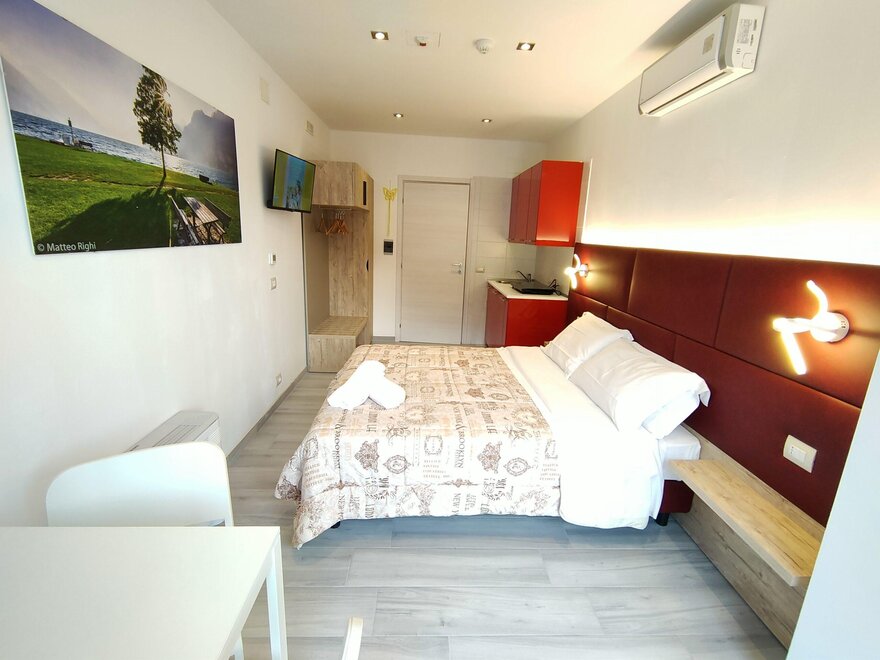 Die Studios befinden sich im ersten und zweiten Stock und verfügen über einen Wohnbereich mit Küchenzeile und Doppelbett. Für Kinder steht ein Klappbett zur Verfügung.