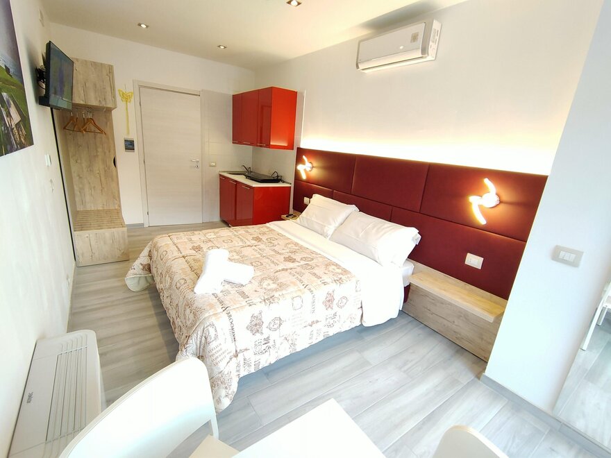 Kleine Studios im Erdgeschoss verfügen über einen Wohnbereich mit Küchenzeile und Doppelbett.