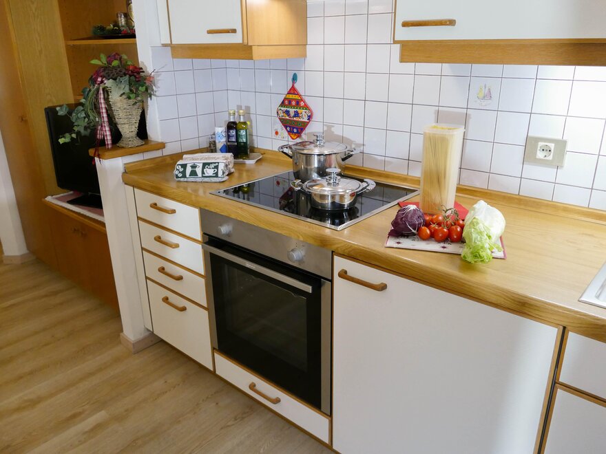 Kochecke mit Geschirrspülmaschine, Kühlschrank mit Gefrierfach, Glaskeramik-Kochplatte, Backrohr, und Holzfußboden;