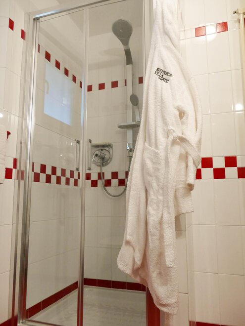 ein Bad mit Dusche, Waschbecken, WC, Bidet, Haarfön, Holzfußboden;