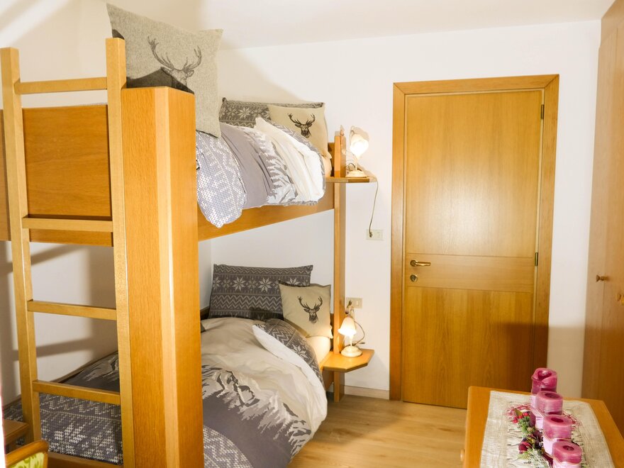 ein Schlafzimmer mit ein Etagenbett, Kleiderschrank, Komode und Holzfußboden;
