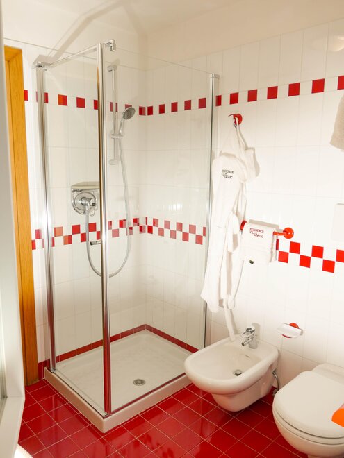 Ein Bad mit Dusche, Waschbecken, WC, Bidet, Haarfön, verfliestem Fußboden;