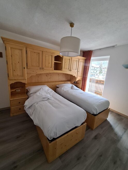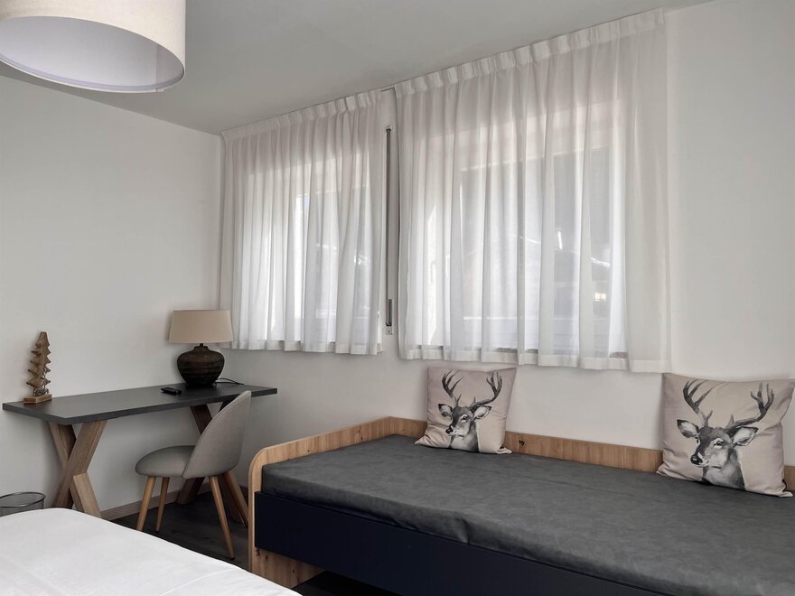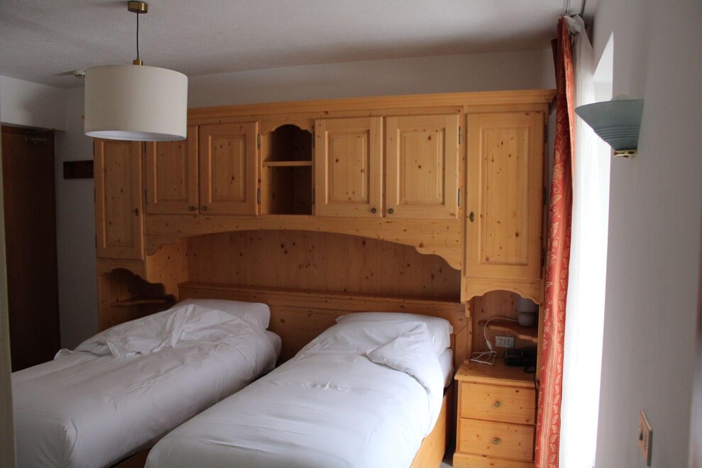 Zimmer mit Fenster und Blick auf die Berge, die uns umgeben: Rosengartengruppe, Langkofel, Col Rodella, Pordoi und Sass Becé.Betten Verteilung
